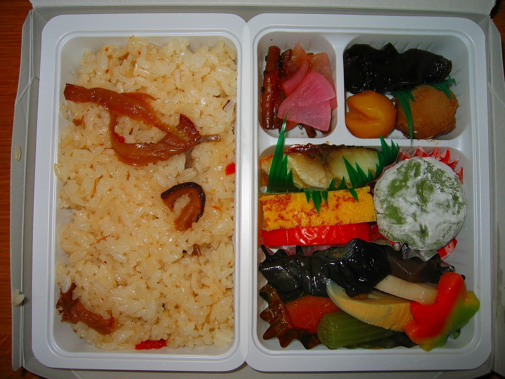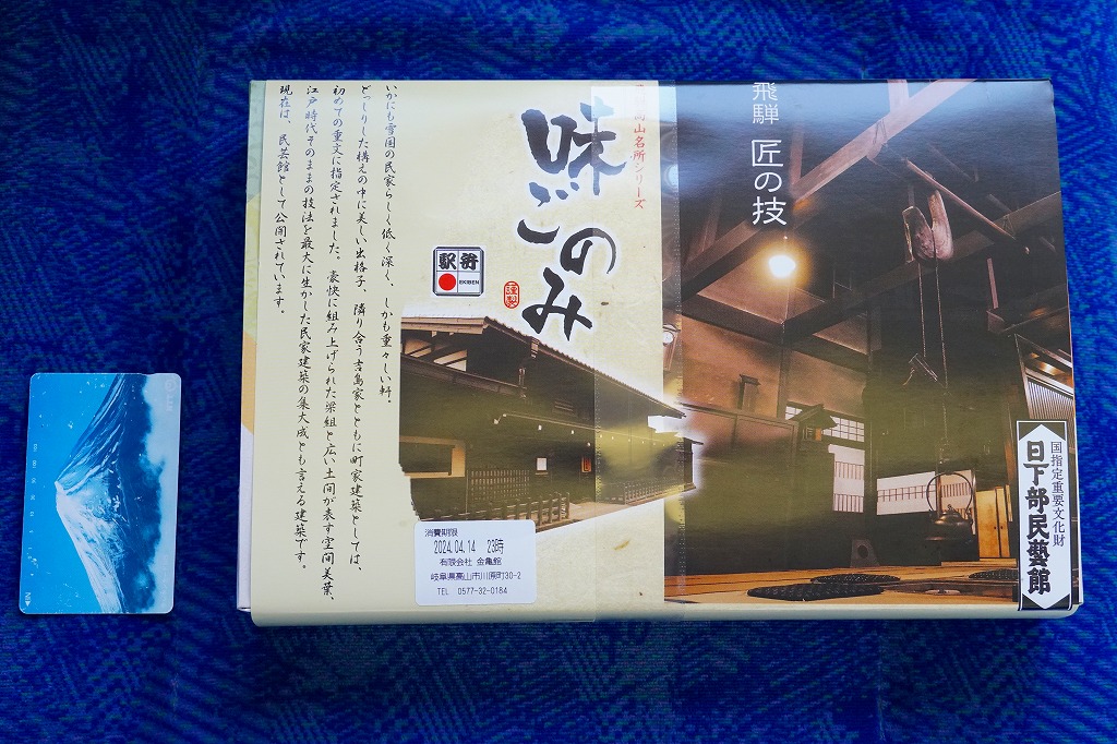 上記の駅弁「味ごのみ」の、2024年時点での姿だと思い、高山駅で購入。市販の四角い仕出し弁当向け容器に、国指定重要文化財日下部民藝館の写真を使う掛紙を巻き、飛騨高山名所シリーズを名乗る。中身は上記の2003年のものとだいたい変わらず、日の丸御飯、煮魚とかまぼこと玉子焼、海老や昆布などの煮物、山菜や煮豆、鶏唐揚、漬物など。しかしこの日の前も後もネット上では、上記の正八角形の「味ごのみ」の写真がアップされている。高山祭の開催日という繁忙時に限り、その姿と形を変えたのだろうか。