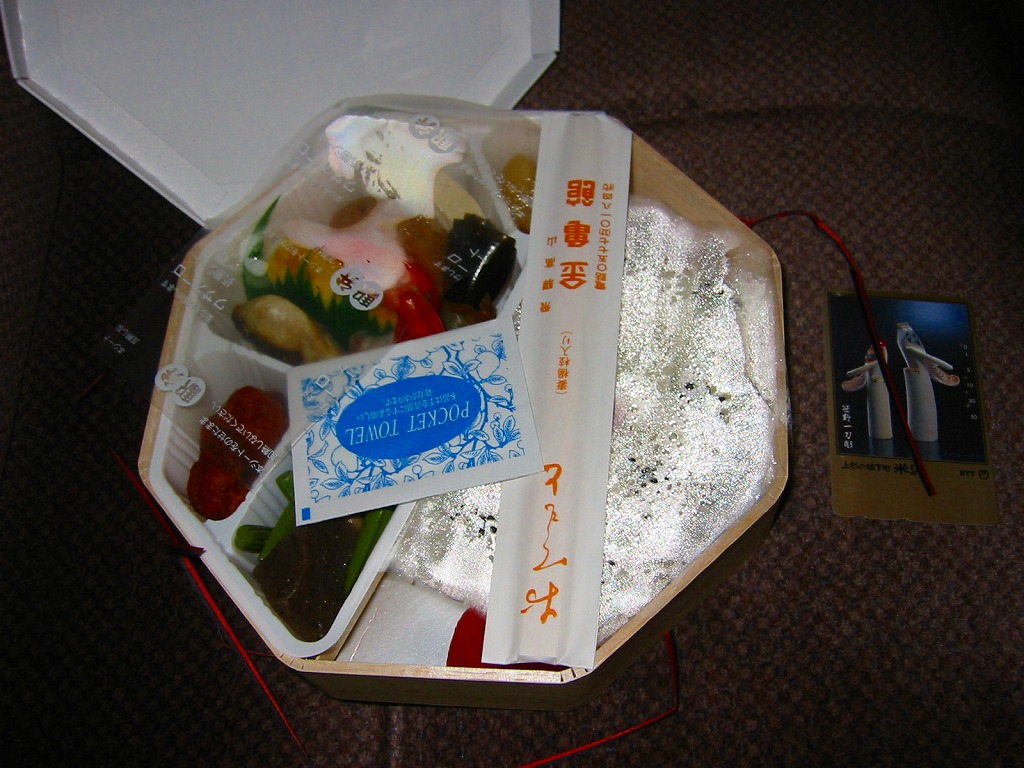 1960(昭和35)年9月に高山駅で発売。四隅のうち二箇所だけカットが入ったふたも底も枠も経木の容器に、高山の中学生が彫った木版画を描いた掛紙をかける。ふたを開けると飛騨の合掌造の民家が登場。一階には川魚や煮物類、二階にはワラビやクルミの山菜類、三階には漬物、そして屋根には白御飯の雪が積もっている。味覚でも視覚でもいただける、幕の内弁当タイプの駅弁。