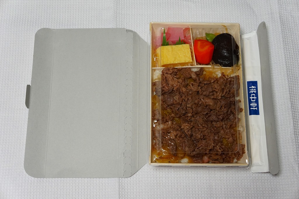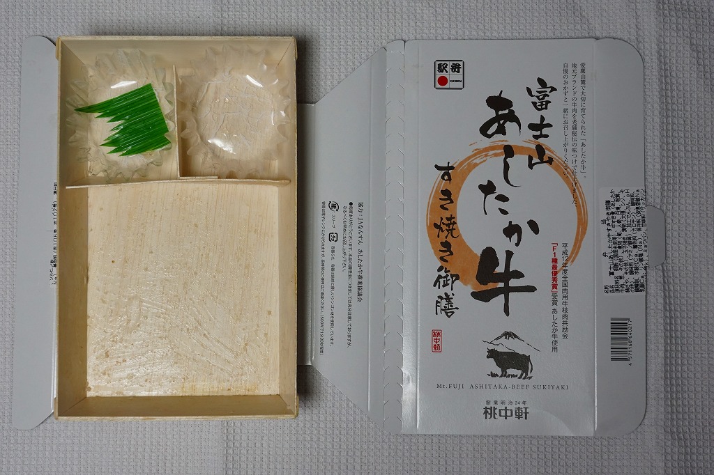 木製エコ容器に白御飯を詰め、牛肉煮とタマネギ煮で覆い、しらたきやシイタケなどの煮物、玉子焼、大根桜漬を添える。肉の固さとタマネギの多さで、牛丼や牛肉駅弁でなく牛すき焼きの弁当を食べている感じがたっぷり。2020年2月頃までの販売かもしれない。