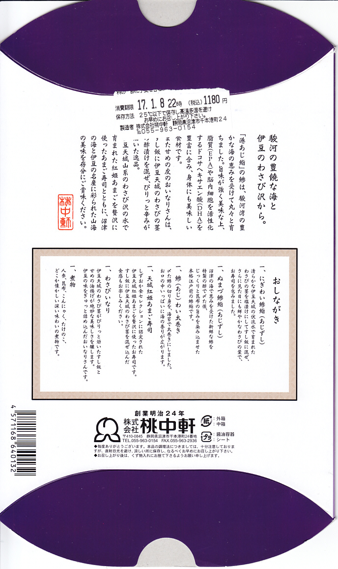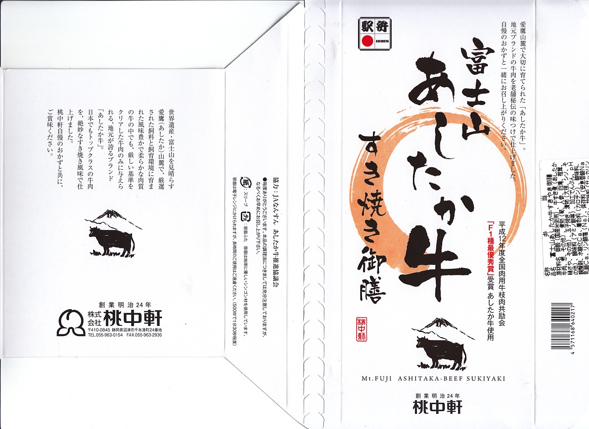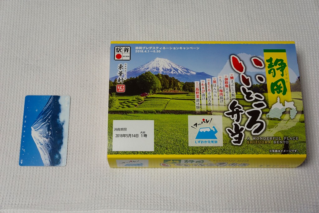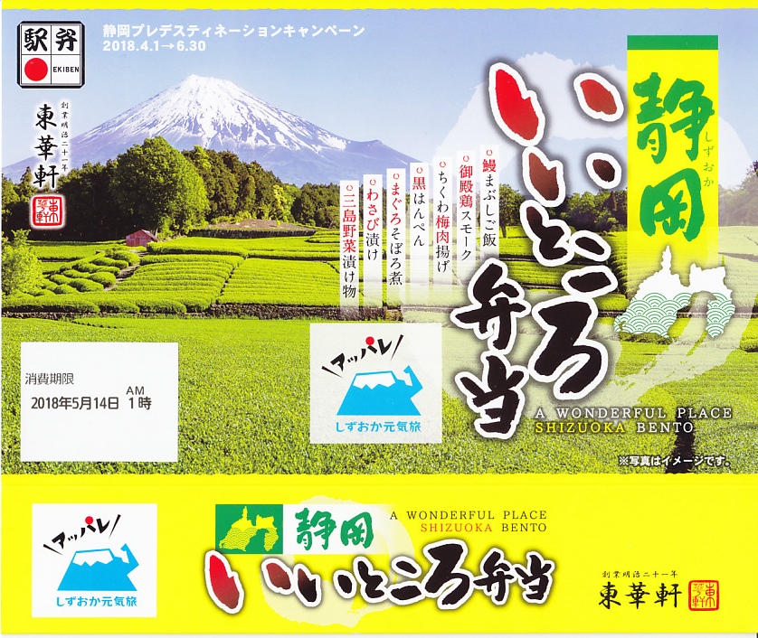 2019年4月から6月までのJRグループの観光キャンペーン「静岡デスティネーションキャンペーン」の実施に向けて、その1年前を「プレキャンペーン」と位置づけ、2018(平成30)年4月から6月までの販売。調製元は神奈川県は小田原駅の駅弁屋だが、昭和時代から熱海駅の駅弁屋でもあり、熱海は静岡県なので、こうやって静岡の駅弁を作って売る。