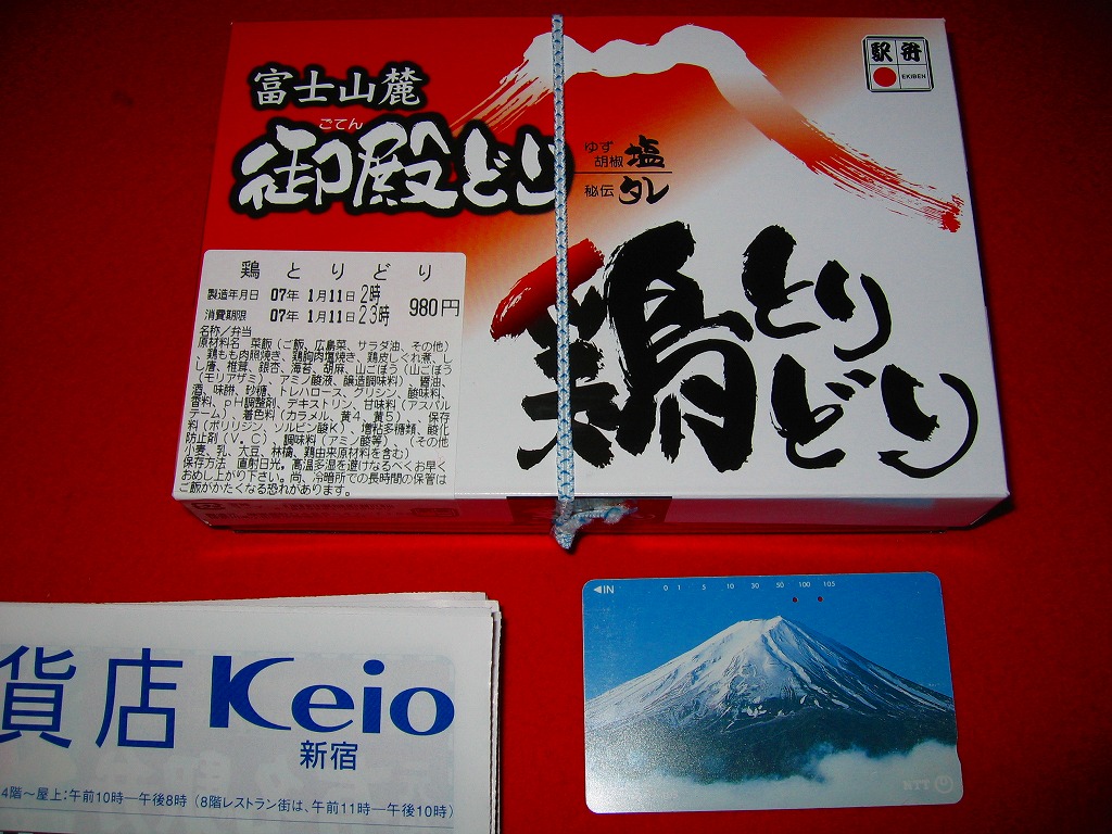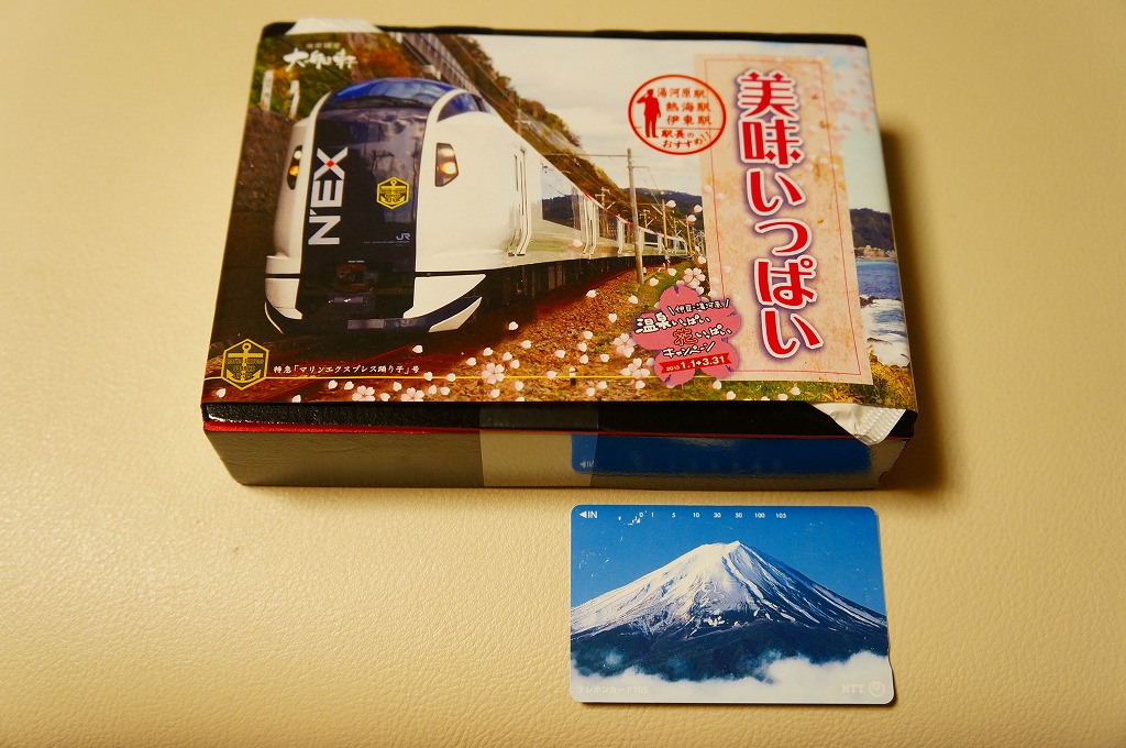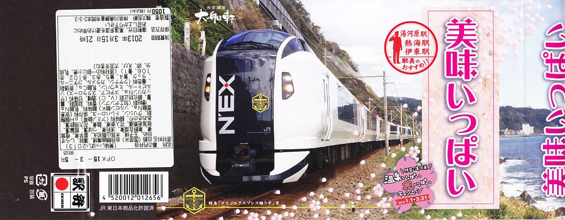 掛紙には「成田エクスプレス」向けE259系電車の写真。2012年12月に東京駅と伊豆急下田駅を結ぶ臨時特急列車「マリンエクスプレス踊り子」で、伊豆方面にも進出してきた。これで、通常の踊り子号で使われる、国鉄時代の昭和50年代から走り続けるJR東日本で最古級の特急電車185系は、この車両で置き換えられるのだろうかと噂されるようになった。