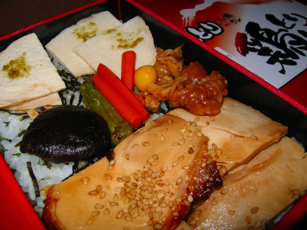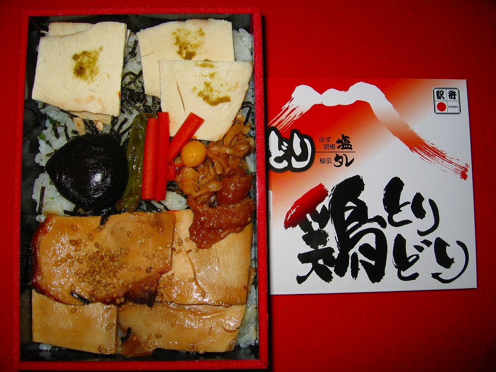 2006(平成18)年4月28日に発売。小さな長方形の赤い黒塗り容器に、食品表示ラベルの貼付に対応したデザインの駅弁大会映えするボール紙のふたをして、ゴムで留める。中身は菜飯の上にさっぱりタイプの鶏胸肉塩焼と、しっとりタイプの鶏もも肉照焼の鶏板2種を貼り、鶏皮しぐれ煮も添えて椎茸、銀杏、山ごぼう、ししとうで彩る。