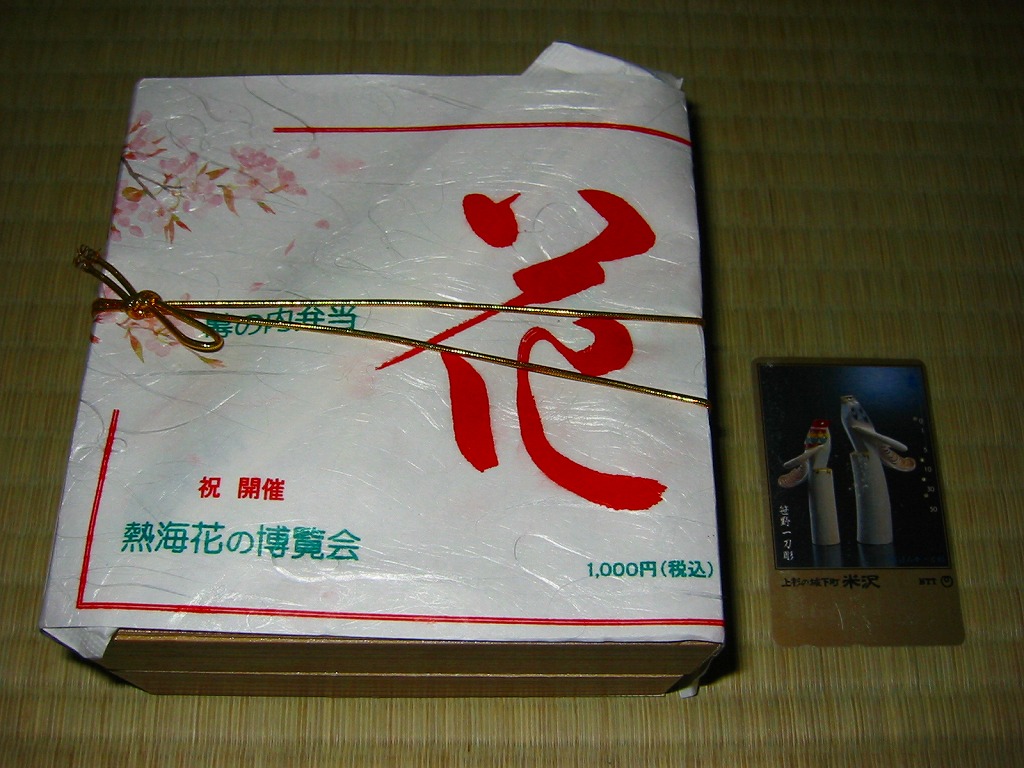 熱海花の博覧会の開催に合わせて、2004(平成16)年3月頃に発売。木目印刷の美しい正方形の容器を重ね、和紙に桜を描いた掛紙をかけて金色の輪ゴムでしばる。中身は下段が桜花付白御飯に焼き魚と鶏そぼろと玉子焼、上段が煮物や紅白の蒲鉾に海老串に桜饅頭など。具の入るミニカップもほんのり桜色で、味が良い以上にそのコンセプトの明確さも風味を出す。現存しない模様。