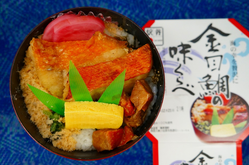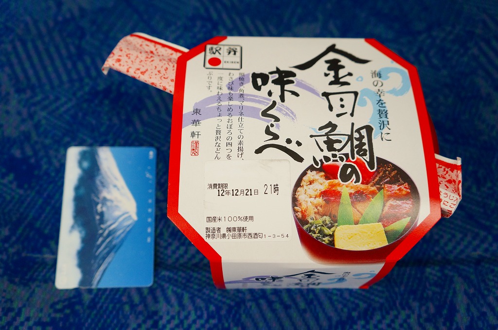 2011(平成23)年の秋までに発売か。調製元は小田原の駅弁屋であるが、この駅弁はどちらかというと熱海駅の駅弁として紹介されることが多い。朱塗りな円形のプラスティック製容器に御飯を詰めて、キンメダイを角煮、マリネというか天ぷら、照焼、フレークというかおぼろの4種のスタイルで載せて、玉子焼、赤カブ漬、広島名漬などを添える。伊豆半島で人気の食材を使い、シンプルでも表情豊かなお味で、現在の熱海駅を代表する駅弁になったのではないかと思う。価格は2012年の購入時で900円、2014年時点で1,000円。2017年までの販売か。