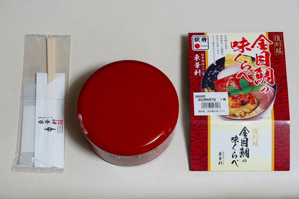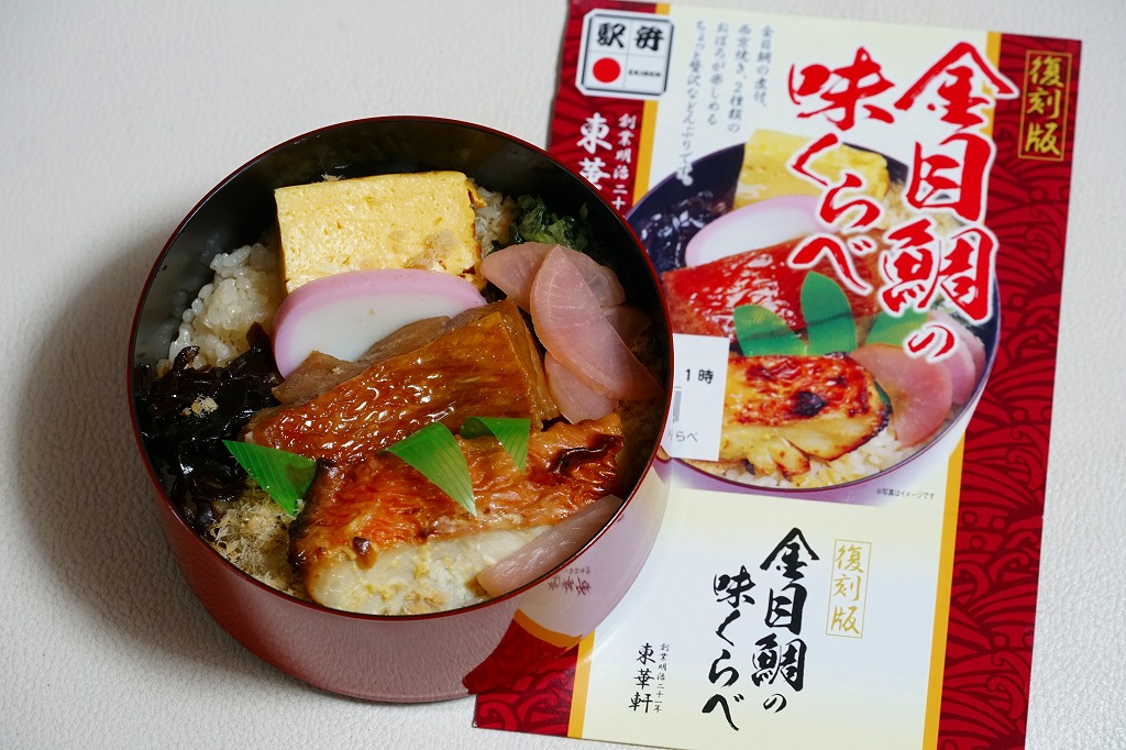 2022(令和4)年8月上旬に東京駅の駅弁売店「駅弁屋 祭」で販売か。調製元や販売元の発表や広報がないので分からないが、どうもこの駅弁売店の10周年を記念した商品のようで、10年前のリニューアルオープン時に存在した駅弁「金目鯛の味くらべ」を復刻したものらしい。商品名と中身の写真でできたスリーブに「復刻版」と書いてある。