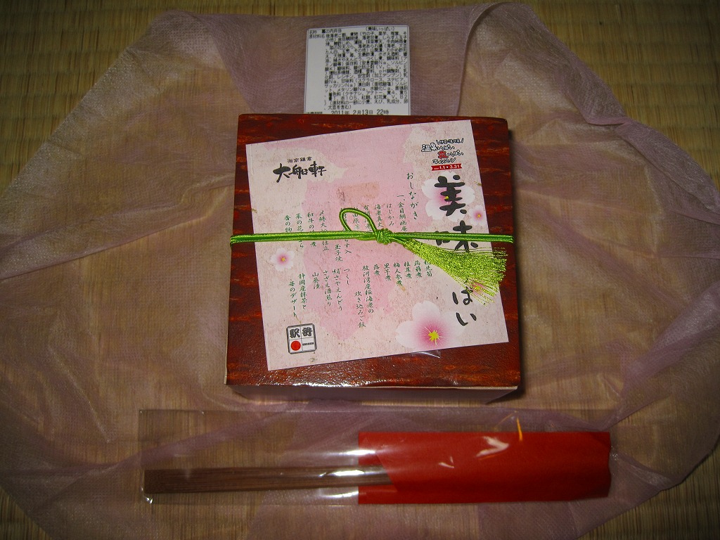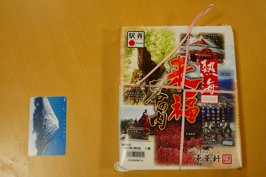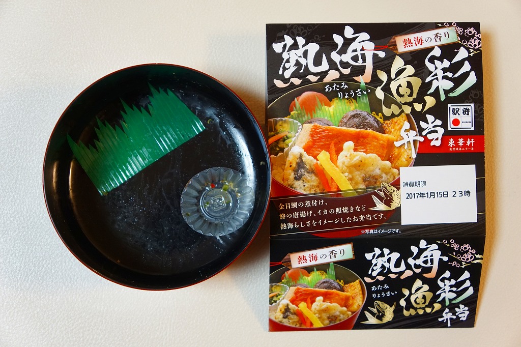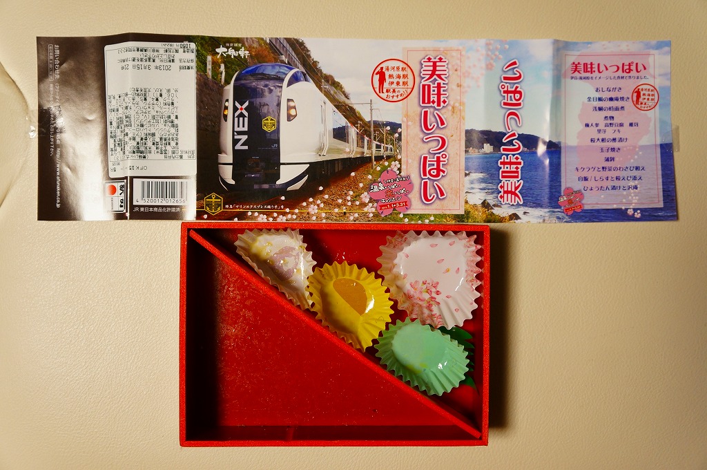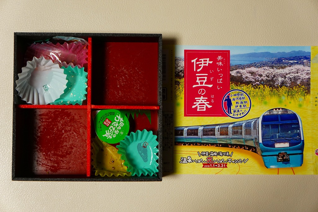 JR東日本横浜支社の観光キャンペーン「伊豆・湯河原 温泉いっぱい 花いっぱいキャンペーン」に伴い、2016(平成28)年1月10日から3月31日まで、熱海駅や大船エリアや東京都内で販売された期間限定駅弁。熱海駅の駅弁とされるが、調製元は大船駅の駅弁屋である大船軒。松花堂の4区画に収めた今回の中身は、サフランライス、サクラ酢飯、玉子焼と蒲鉾とシラスとひじきとわさび漬カップ、アジフライとタイ味噌焼とマグロ和えとよもぎ団子だった。