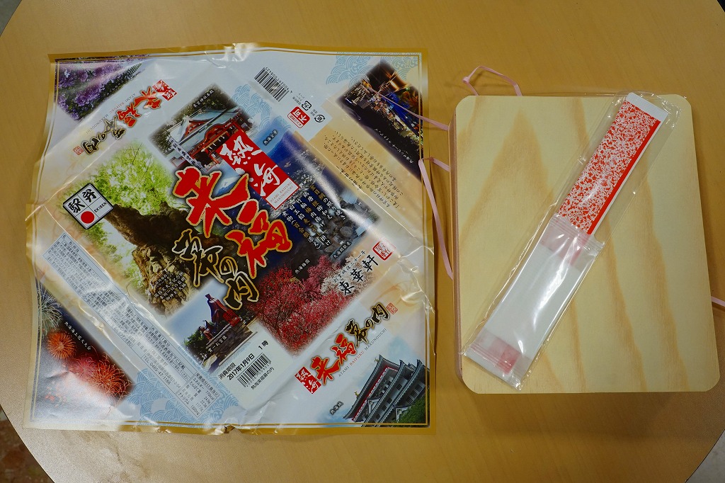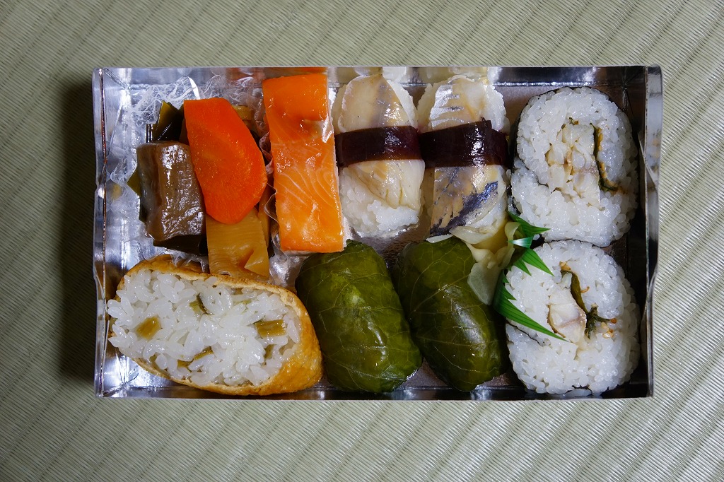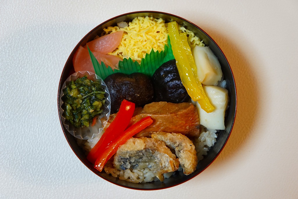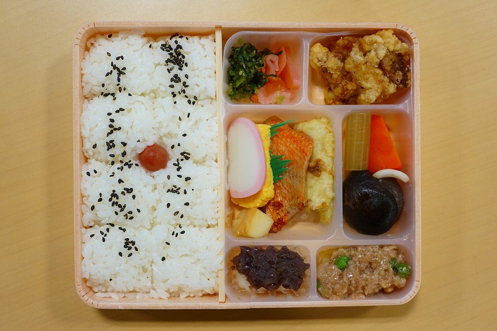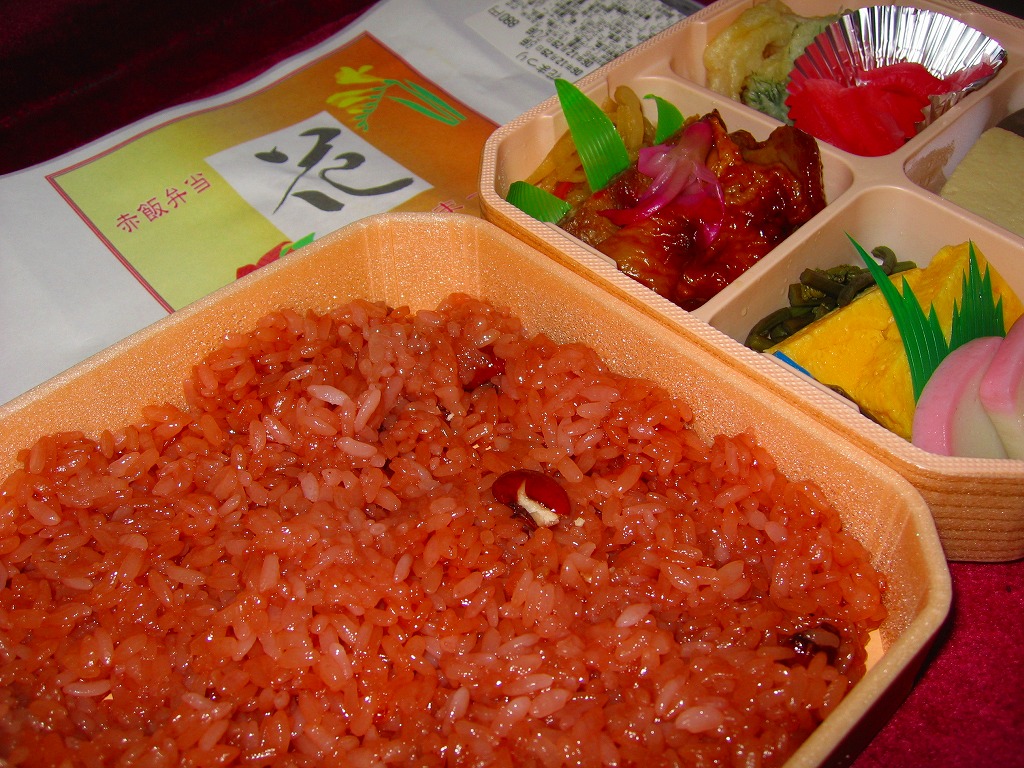 正方形のプラ製の惣菜容器を二段重ねにして、インク式カラープリンタで刷った簡素な掛紙を巻く。中身は下段に色の濃い赤飯を一面に詰め、上段には高野豆腐などの煮物、タラの芽などの天ぷらと大根つぼ漬け、マグロ照焼と鶏照焼と切り干し大根、蒲鉾と玉子焼などを松花堂風に詰める。