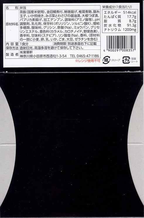 2016(平成28)年秋の新作か。小田原駅や熱海駅の他の駅弁でも使われる、黒くて丸くて硬いプラ容器に、コンブかワカメの混ぜ御飯を詰め、キンメダイ煮付1切れ、アジ唐揚げ2個、シイタケ煮2個、錦糸卵、イカ照焼2個、みぶ菜とわさびの醤油漬、ダイコンつぼ漬、パプリカで覆う。駅弁大会で買える千円以下の駅弁として、出色の出来。常温や冷蔵の範囲で、魚と飯をモリモリいただける。1年弱ほどの販売か。