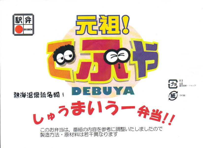 2004(平成16)年4月30日にテレビ東京系列で放送された番組「元祖!でぶや」で、石塚英彦・パパイヤ鈴木の両氏により企画製作されたお弁当。翌5月1日から熱海駅にて、ゴールデンウィーク期間中限定で毎日30個限定で発売され、好評のため大増産された模様。筆者は購入できず。5月9日からリニューアルを経て発売が再開されたそうで、写真のものと当初発売のものが同一かどうかは不明。