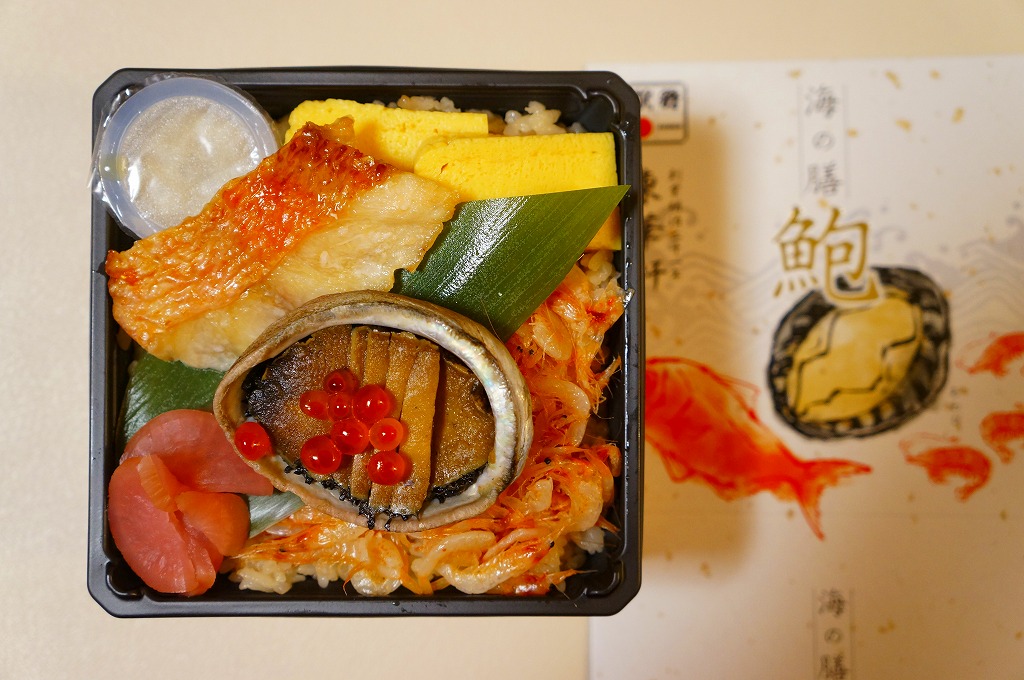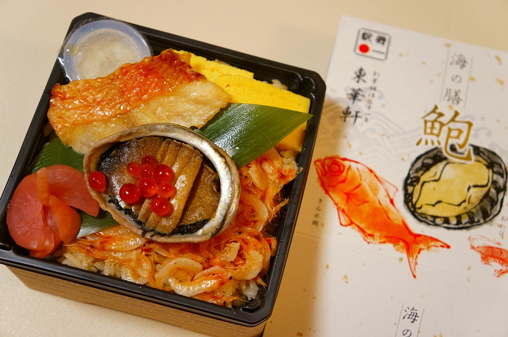 実演販売では、駅弁催事業者のスタッフが調製も販売も担当。食べた感じでは、たっぷりジューシーなサクラエビ、色濃くも臭みや変な固さのない都会的なアワビ、小田原駅弁でも味の良いキンメダイ焼などと、風味は良好。しかし悪かったのは、催事場での立地か、価格か内容か、客がまったく付いておらず気の毒だった。