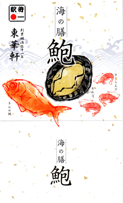2014(平成26)年1月の京王百貨店の駅弁大会で、熱海駅の駅弁として実演販売。現地で売られたかどうかは、定かでない。四角く背の高い容器を収めるボール紙の枠に書かれるとおり、中身は炊込飯の上を、アワビの煮貝、キンメダイの塩焼き、サクラエビの塩煮で覆い、玉子焼、わさび漬け、大根つぼ漬、味付イクラを添える。