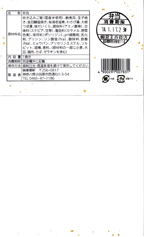 下記の駅弁「美味いっぱい」の2013(平成25)年版で、1月から3月までの販売か。2011年版の1,800円、2012年版の1,500円、そしてこれは1,050円と、価格が年々下がっている。今回の中身はサクラエビとシラスの御飯、キンメダイ幽庵焼、キクラゲ、かまぼこ、玉子焼、サトイモやシイタケなどの煮物、つぼ漬など。調製元は引き続き大船軒。掛紙では湯河原、熱海、伊東の各駅での販売と読めるが、こうやって小田原駅でも買えた。
