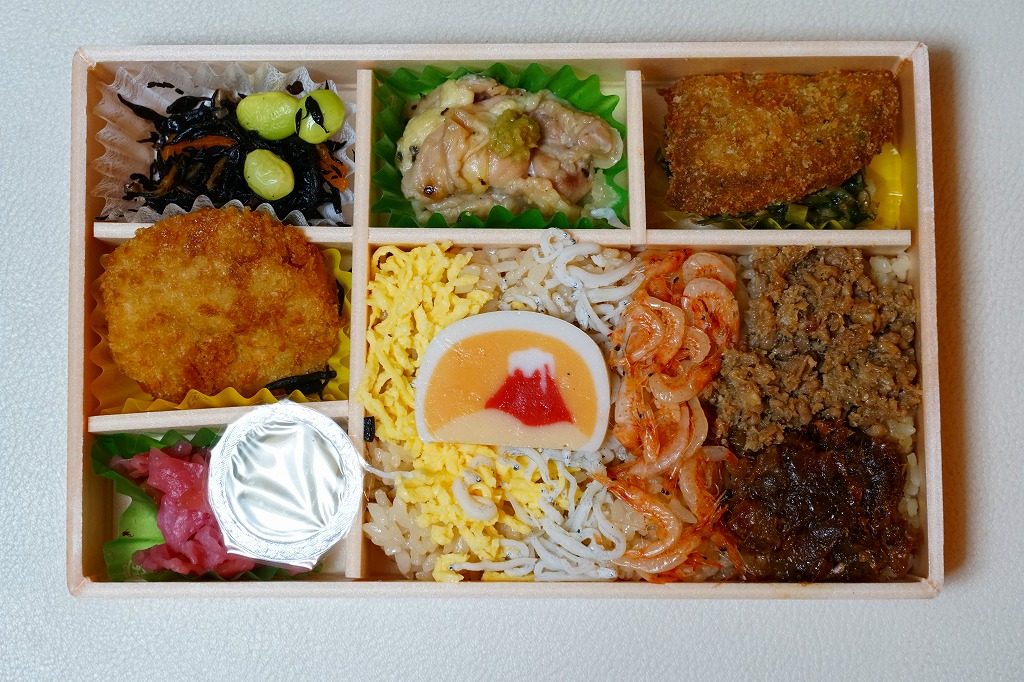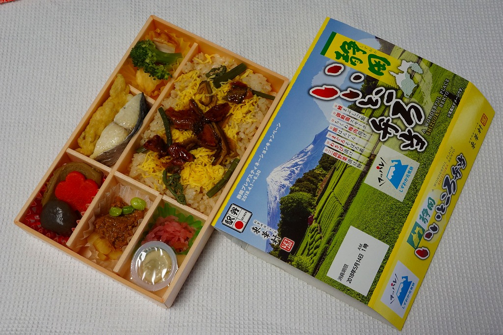スリーブは2年前と同じ場所で撮ったとみられる富士と茶畑の写真と、様々なロゴマークでできている。おしながきに加えて写真もそこに加えた中身は、茶飯をキンメダイ有馬煮、豚しぐれ煮、サクラエビ甘煮、じゃこ塩茹で、錦糸玉子で覆う「山海彩りごはん」に、富士柄のかまぼこ、ハーブ鶏、ひじき煮、三島コロッケ、黒はんぺん、みぶなとわさびの醤油漬、わさび漬、箱根大根の漬物。静岡県の全体でなく東部、主に富士山より東側の内容でできていた。