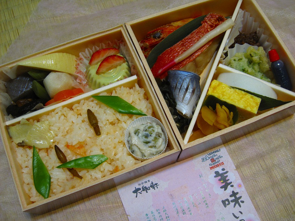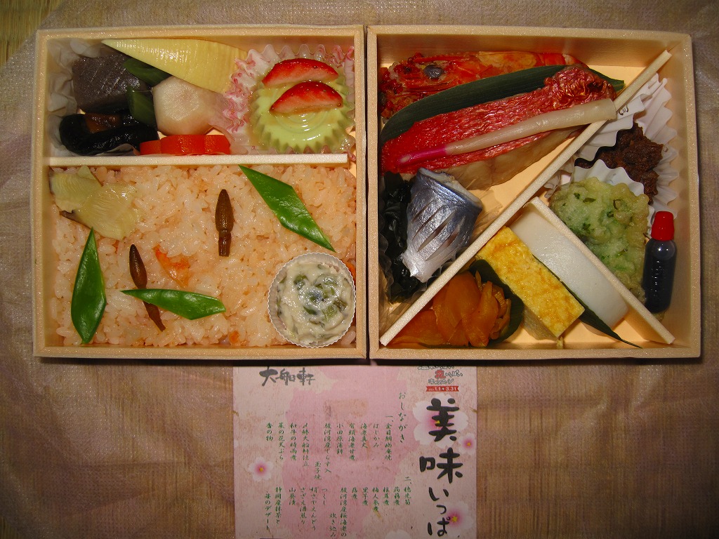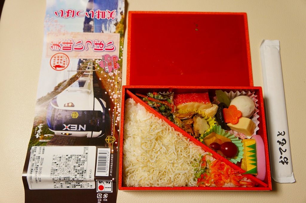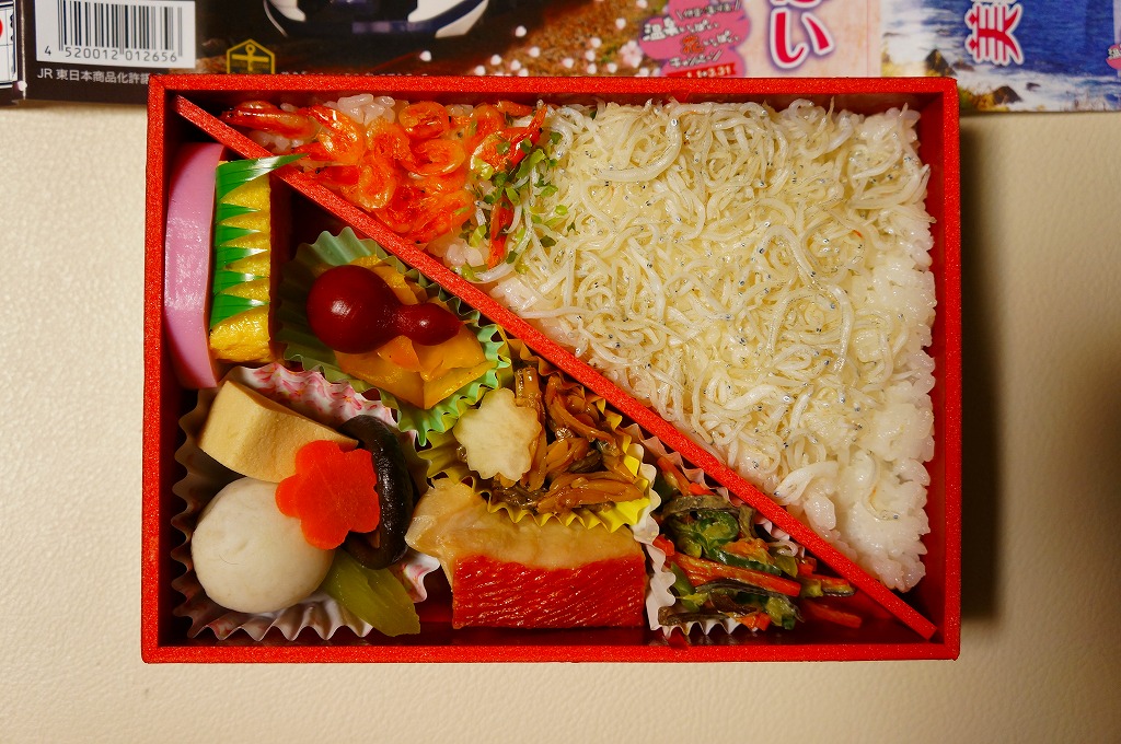木製重箱柄の容器を二段重ねにして、おしながきを置いたうえで桃色な和紙風の風呂敷で包む。中身は下段がサクラエビの炊込飯、サトイモやタケノコなどの煮物、イチゴと抹茶プリン、上段がキンメダイ幽庵焼、海老しんじょう、有頭海老、玉子焼、厚く白いかまぼこ、しめアジ、牛肉しぐれ煮、菜の花の天ぷらなど。値段が高くないか、とか、これが幕の内弁当なのか、容器と包装が安っぽい、など突っ込みどころはあるけれど、記念駅弁、期間限定駅弁として、中身は好ましくふさわしく食べやすい印象。