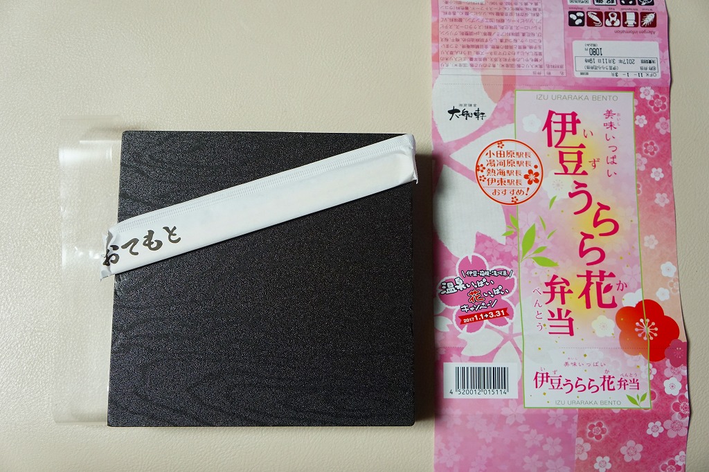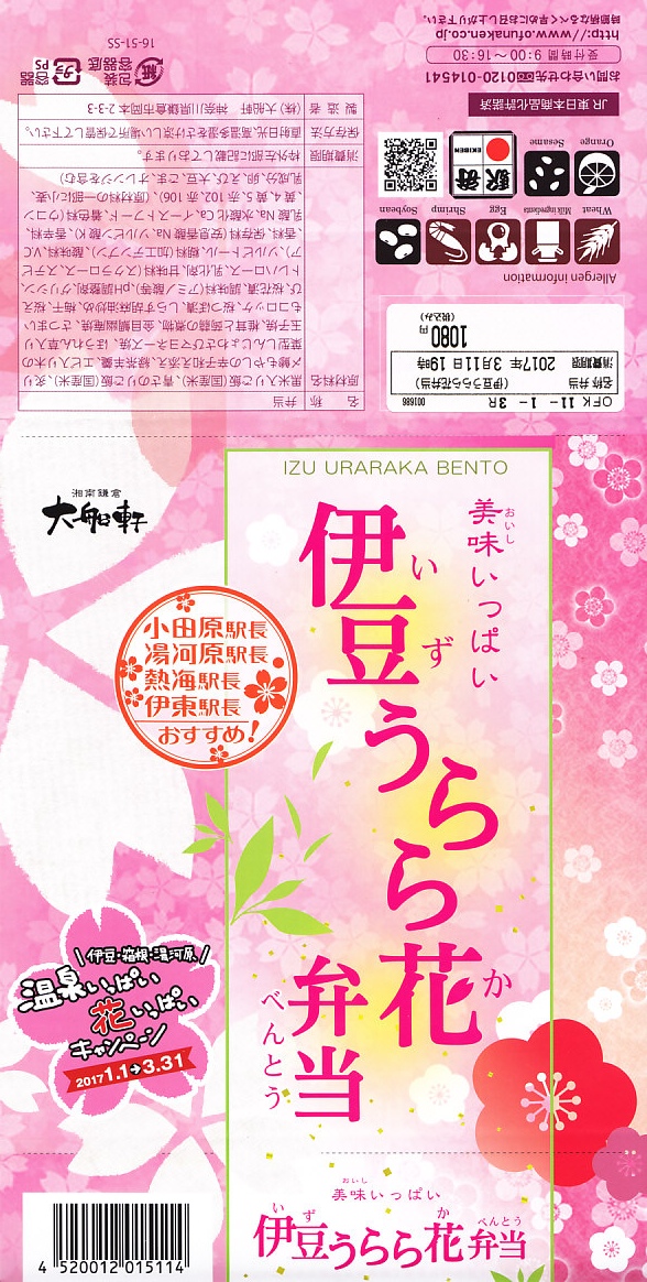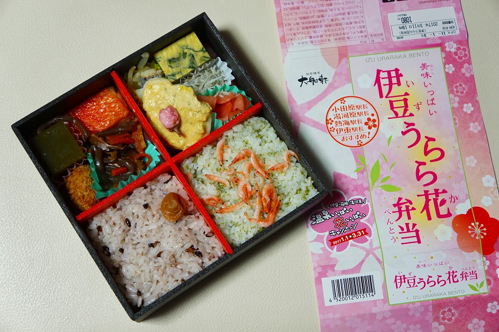 JR東日本横浜支社の観光キャンペーン「伊豆・箱根・湯河原 温泉いっぱい花いっぱいキャンペーン」に伴い、2017(平成29)年1月10日から3月31日まで、熱海駅や大船エリアや東京都内で販売された期間限定駅弁。大船駅弁の大船軒と、横浜駅弁の崎陽軒が、このキャンペーンの駅弁を出したが、小田原駅弁や熱海駅弁の東華軒は出していない。前年と同じなのは、松花堂タイプの容器だけ。桃色の掛紙を巻く真っ黒な容器の中身は、梅干しを載せた黒米入り御飯、サクラエビを載せたあおさ御飯、シラス炒め、サクラエビしんじょう、焼サバともやし、ホウレンソウ入り玉子焼、大根桜漬、キンメダイ焼、こんにゃくとニンジンと椎茸の旨煮、みしまコロッケ、ぐり茶のようかん。