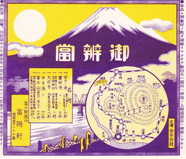第二次大戦前のもの、30銭の価格と三島駅の位置から1930年頃のものと思われる、富士駅弁の掛紙。鉄道の歴史の中では富士の姿は変わらないから、この掛紙にも当然に富士山が描かれる。東海道本線のものと思われる鉄橋もちらりと見える。