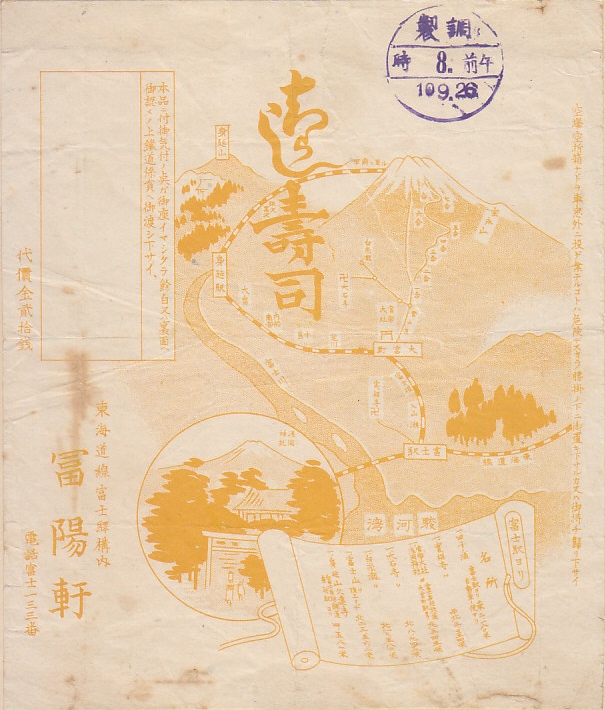 1935(昭和10)年9月26日8時の調製と思われる、昔の富士駅弁の掛紙。富士山に東海道本線と当時の富士身延鉄道線が絡み、バス路線や登山道まで記す地図状の絵柄。この絵柄は大正時代のものにもみえるが、1921(大正10)年では現在の身延線が身延駅までしか開通していない。