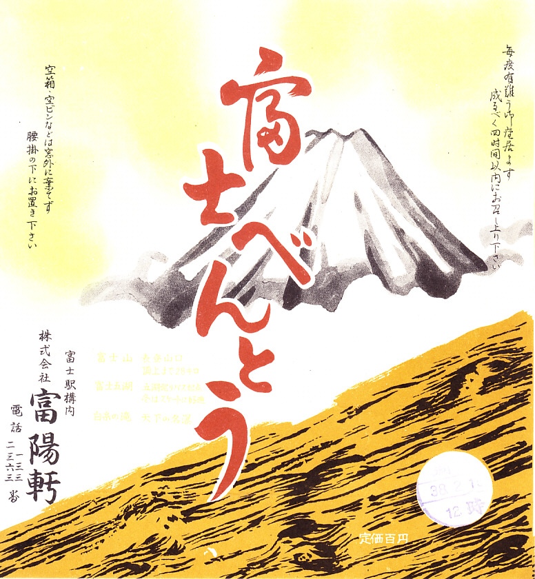 1963(昭和38)年2月16日12時の調製と思われる、昔の富士駅弁の掛紙。並等の幕の内駅弁。富士駅だから富士べんとうか、富士山にあやかったものか。掛紙には当然に富士山が描かれる。