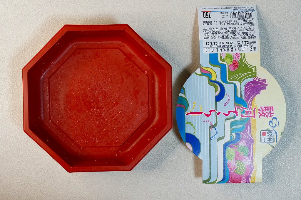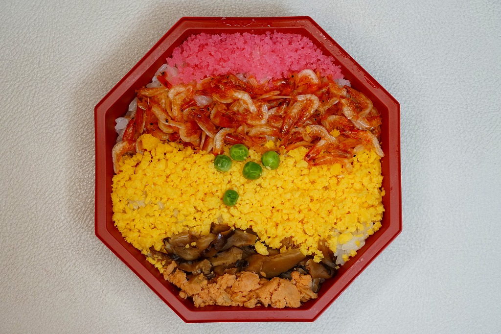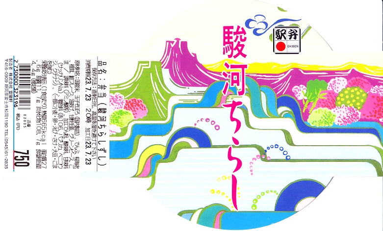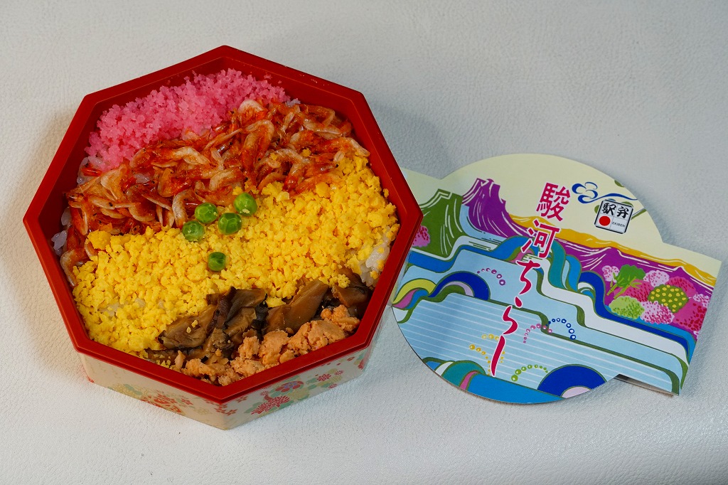 2004(平成16)年頃に630円で発売か。富士山とその他の山並みでデザインしたようなスリーブにはめる、正八角形の容器に白飯を敷き、桜でんぶ、サクラエビ、炒り卵、刻みシイタケ、鮭フレーク覆う。具は散らさず、真横にストライプ。サクラエビを入れるだけで駿河を表現できて便利だなと思った。長らく変わらなかった価格は、2019年5月から750円、2025年4月から840円。