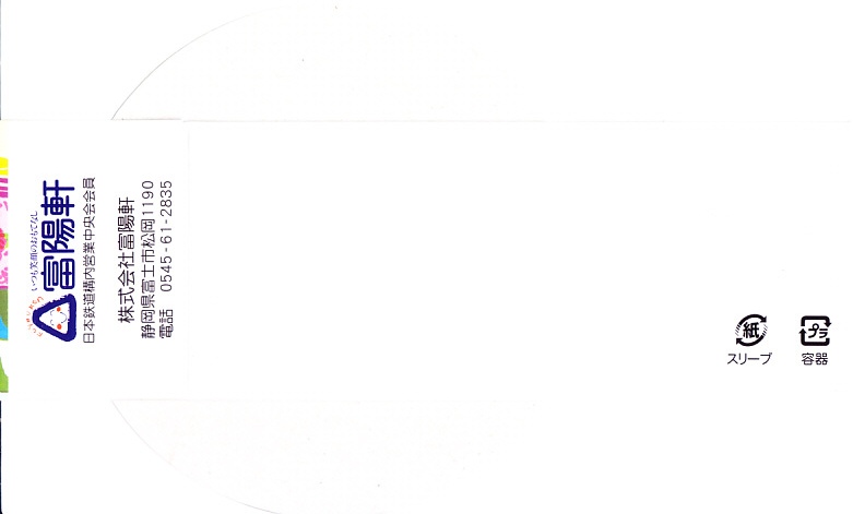 2015(平成27)年8月9日に購入した、新富士駅弁の掛紙。当時はスリーブでなく掛紙を使っていた。それと価格以外は、2023年のものと同じ。2004年頃の発売時から変わらないかもしれない。