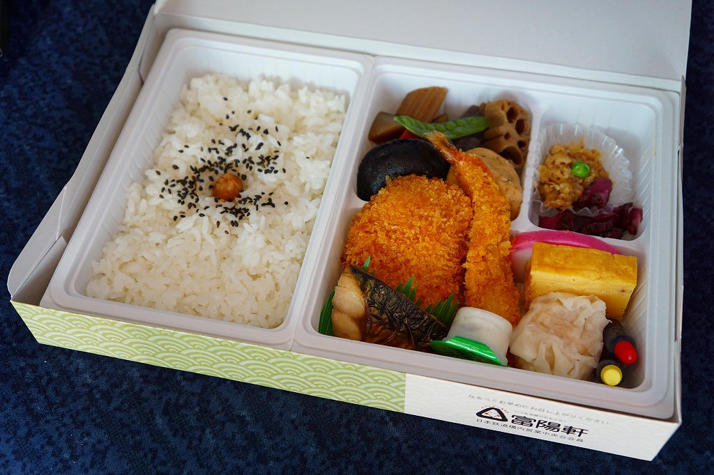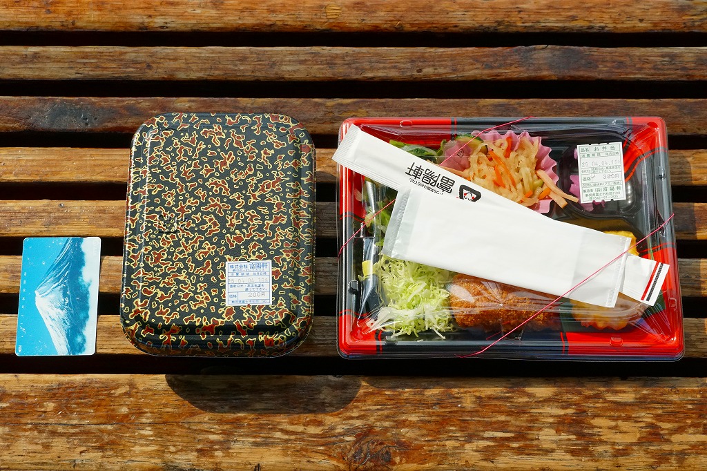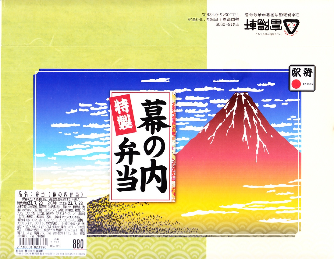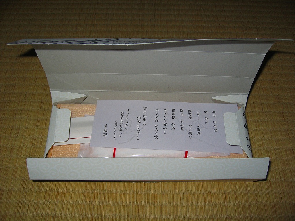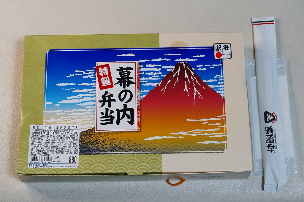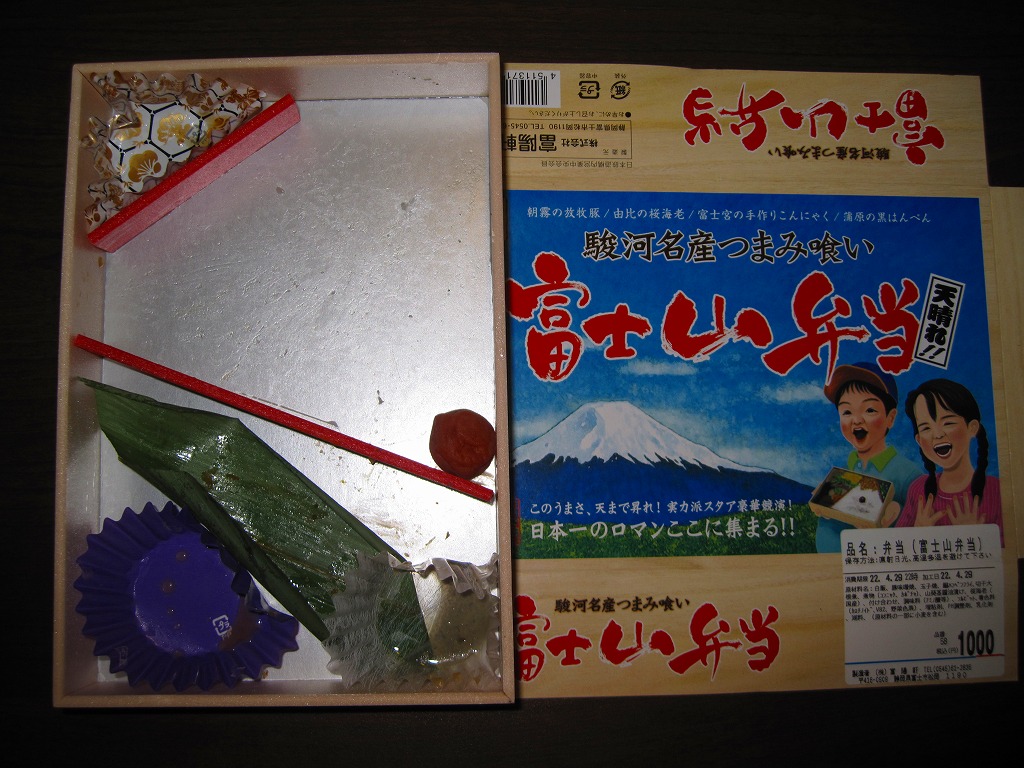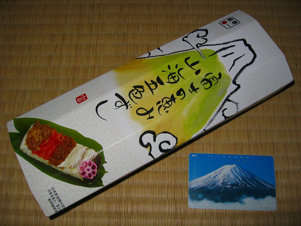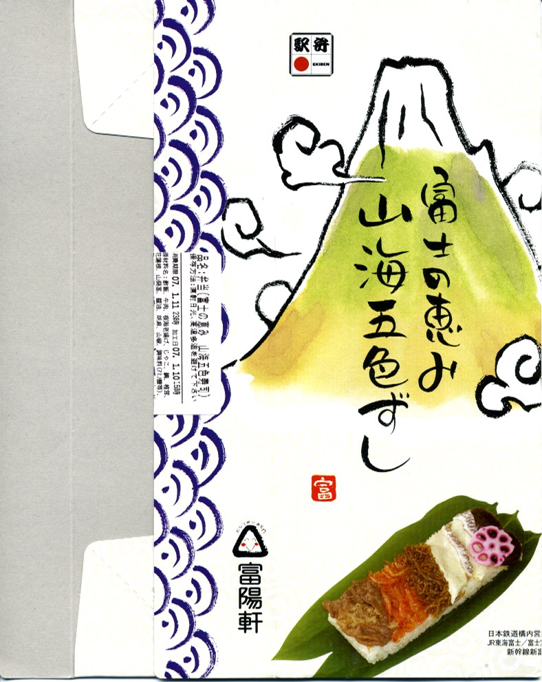 2008(平成20)年1月頃の発売。通常は新富士駅でのみ販売される駅弁。長方形の容器に、昭和中期の漫画の雰囲気を狙ったと思う絵柄のボール紙でふたをする。中身はサクラエビなどで彩る日の丸御飯に、豚肉西京味噌漬、黒はんぺんフライ、玉子焼、こんにゃくやカボチャなどの煮物、茎ワサビなど。富士山周辺の名産品を少しずつ詰めたのだという。副菜がことごとくスパイシーで、個人的には食べるのに難儀した。価格は購入時で1,000円、2014年4月の消費税率改定で1,030円。2016年頃か2019年までの販売か。