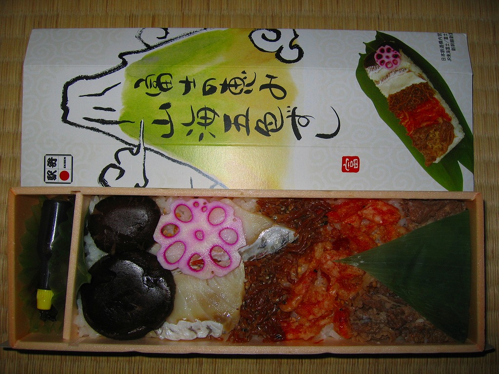 秋冬の駅弁大会シーズンに向けた、2006(平成18)年10月発売の新商品。細長い長方形の容器を、蒲鉾型のボール紙に収納する。中身は笹の葉を敷いたゴマ入り酢飯の上に牛肉甘辛煮、桜海老バラ揚げ、じゃこ山椒煮、鯛の酢締めと花蓮根酢漬、椎茸の含め煮を順番に並べて、茎わさびを添える。