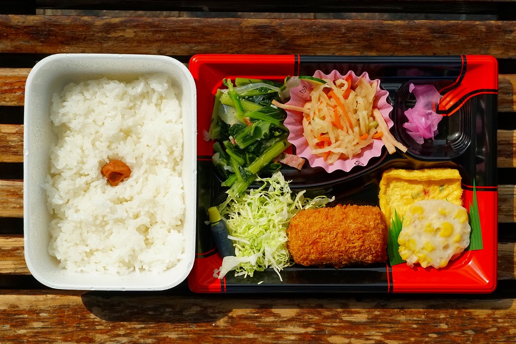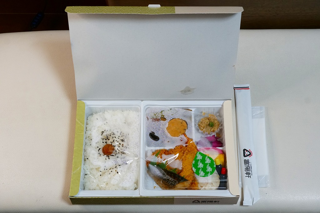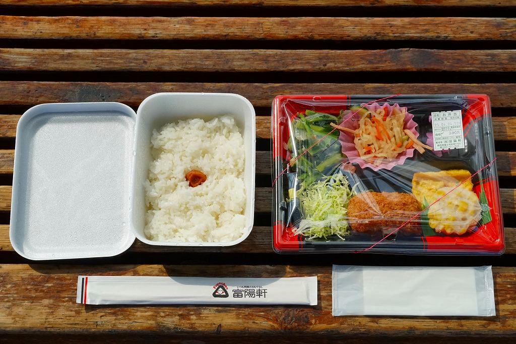 平日のみ営業する新富士駅の駅弁売店で買えたお弁当。売店では「日替り弁当 ¥580(税込)」の値札が付いていた。日の丸御飯を詰めた発泡材の容器と、クリームコロッケ、玉子焼、コーンさつま揚げ、キャベツ千切り、小松菜とベーコンの炒め物、切り干し大根、大根桜漬を詰めた平たいプラ容器の組合せ。それぞれに「200円」「380円」の値札が付いており、惣菜を駅弁売店でセット売りしたのだろう。暖かくはない。見た目に加えて風味も、スーパーの惣菜といった感じだった。