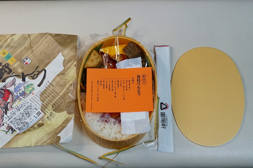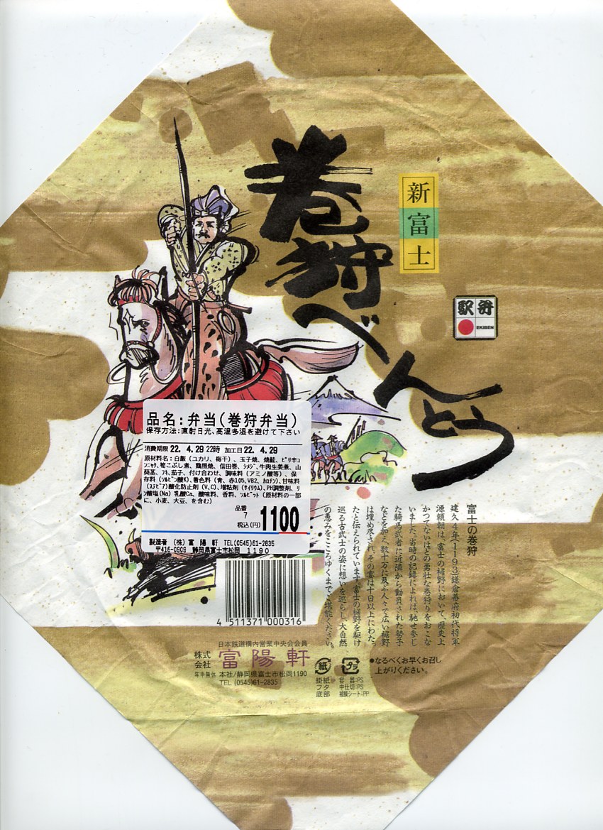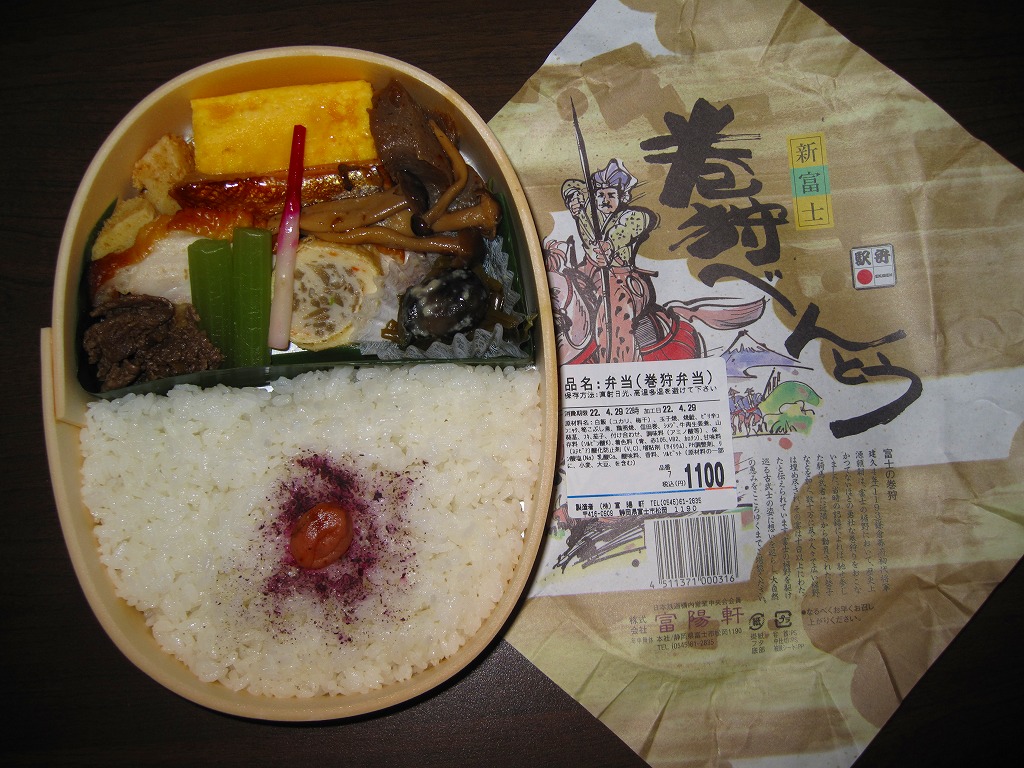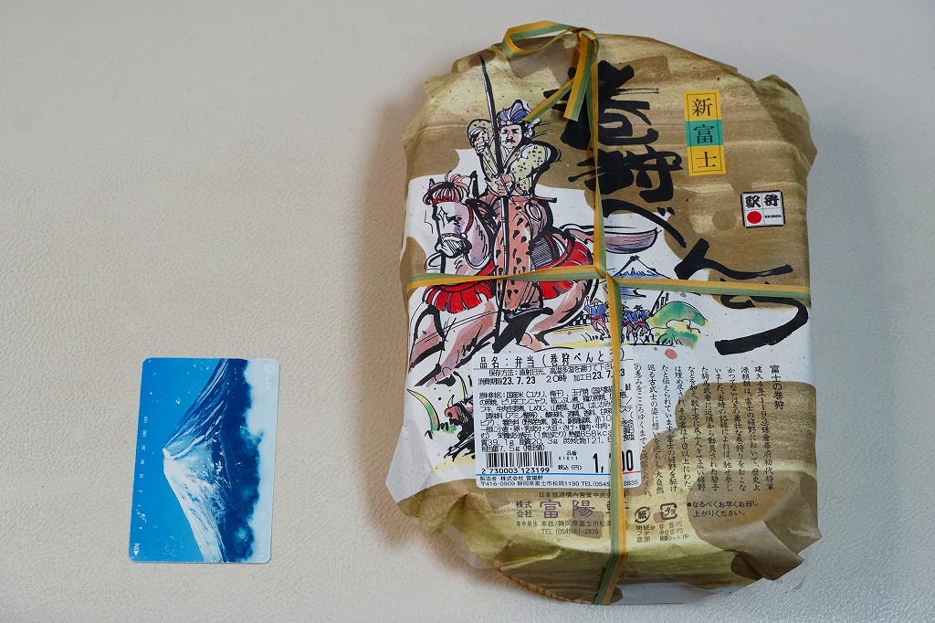 1988(昭和63)年3月13日の新富士駅の開業とともに「新幹線グルメ」のひとつとして誕生した駅弁。楕円形の容器に木目柄のボール紙でふたをして、富士の巻狩のイラストと解説文を印刷した掛紙で包む。中身は日の丸御飯、鮭柚子香焼、牛肉生姜煮、鶏雉焼、玉子焼、タケノコ煮、しめじ煮、ナス漬など。源頼朝が富士の裾野で行った巻狩をイメージしたそうな。おかずがなかなかスパイシーだと思う。価格は1988年の発売時で900円の統一価格、2006年時点で1,000円、2010年時点で1,100円、2019年5月から1,200円、2023年11月から1,300円、2025年4月から1,400円。
