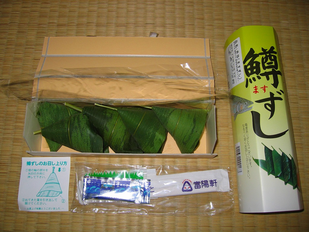 上記の駅弁「笹むすび鱒ずし」の、3個入りバージョン。名前は「鱒ずし3個入」とも。中身は同じだが、容器もパッケージの絵柄もまるで異なる。値段は2017年の購入時で540円、2019年5月から650円。2020年頃までの販売か。