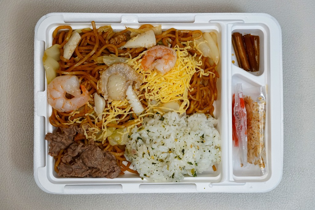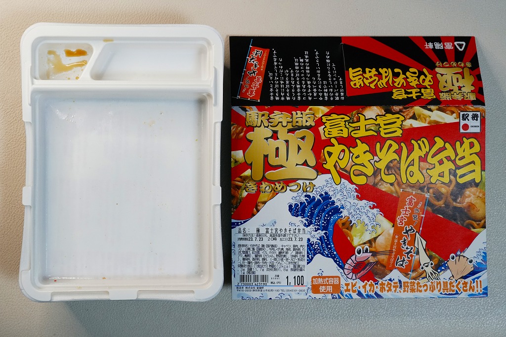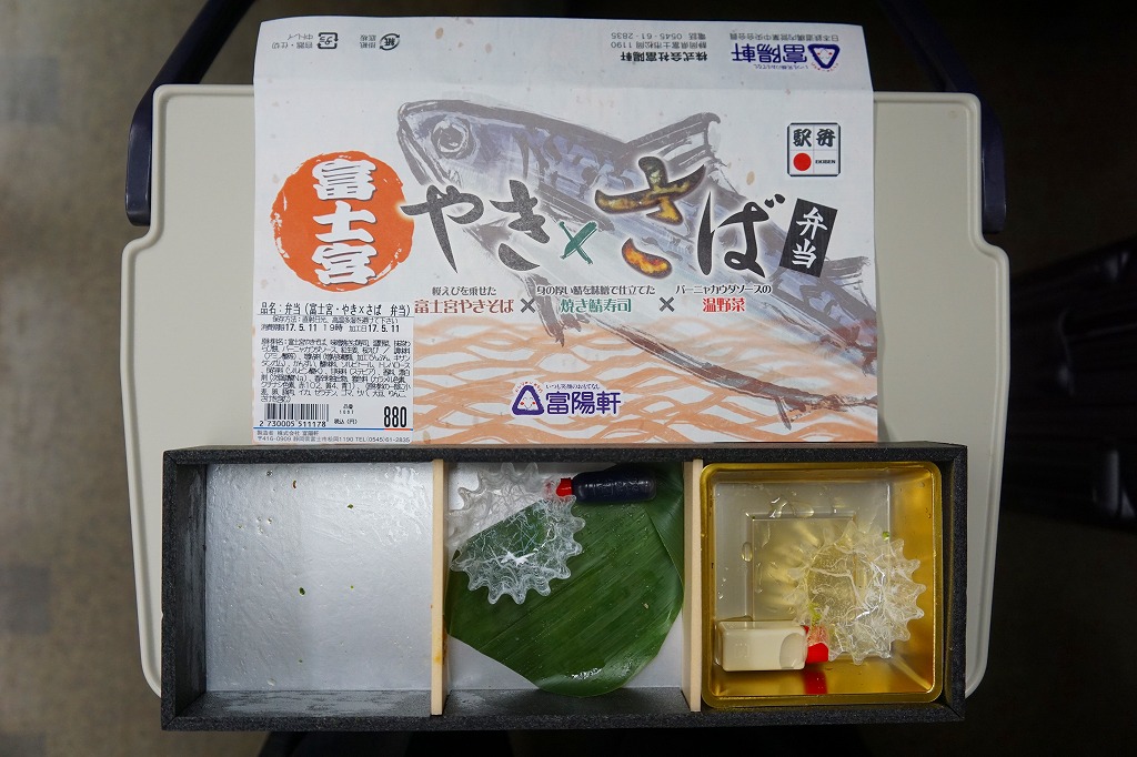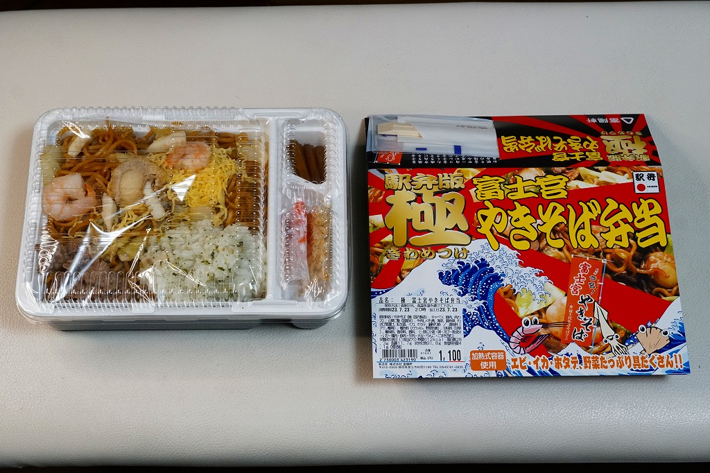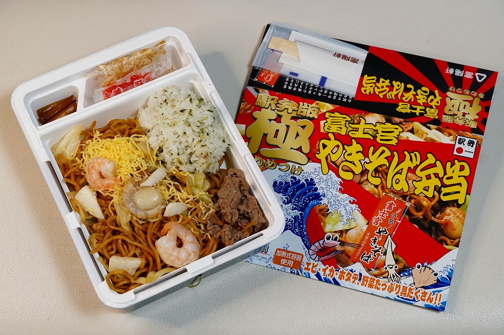 2000年代のご当地グルメブームでの成功事例として全国にその名を広めた富士宮やきそばの特徴である、もちもち太麺の雰囲気が加熱でも常温でも手軽に味わえるのではないかと思う。発売時にはデパートの駅弁催事でも売られ、その実演販売では加熱機能のない容器に掛紙を巻いて売られた。かつての国鉄時代、昭和時代の規制から生まれた、麺類に御飯を入れて「弁当」とする手法が、そんな規制がなくなった今になって、ここで採られたのも興味深い。価格は2005年の発売時で980円、2014年4月の消費税率改定により1,000円、2019年5月から1,100円、2023年11月から1,200円、2025年4月から1,300円。