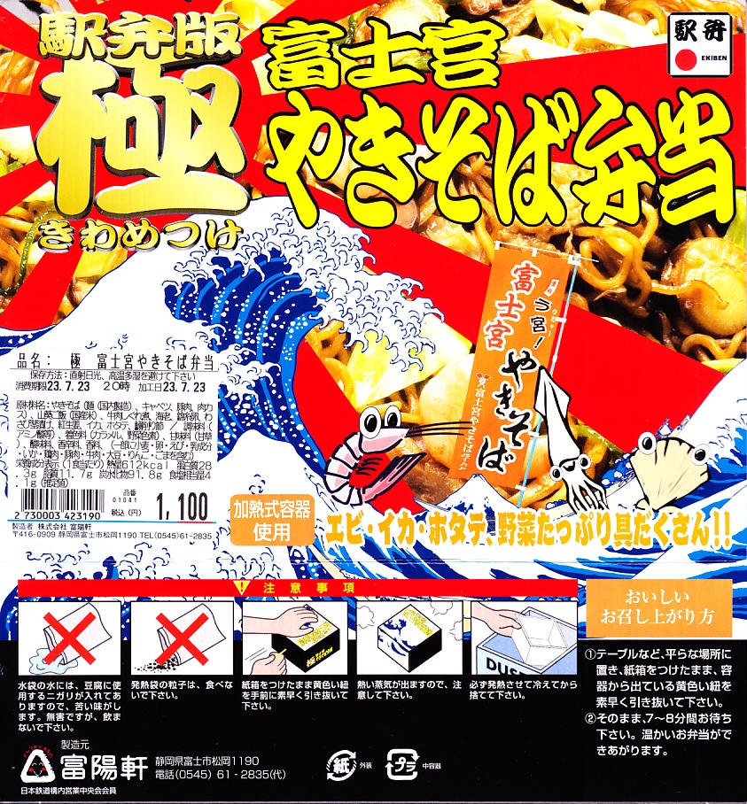2005(平成17)年11月14日に、新富士駅と富士宮駅で発売。史上初のやきそば駅弁だという。四角い加熱機能付き容器を収めたスリーブには、中身の写真や商品名に富士山や波浪や具材などをど派手に描く。中身は海老やホタテやイカや錦糸卵を載せた、豚肉とキャベツ入りの富士宮やきそば、山葵ご飯、牛肉しぐれ煮、わさび茎、イワシの削り節、紅生姜。