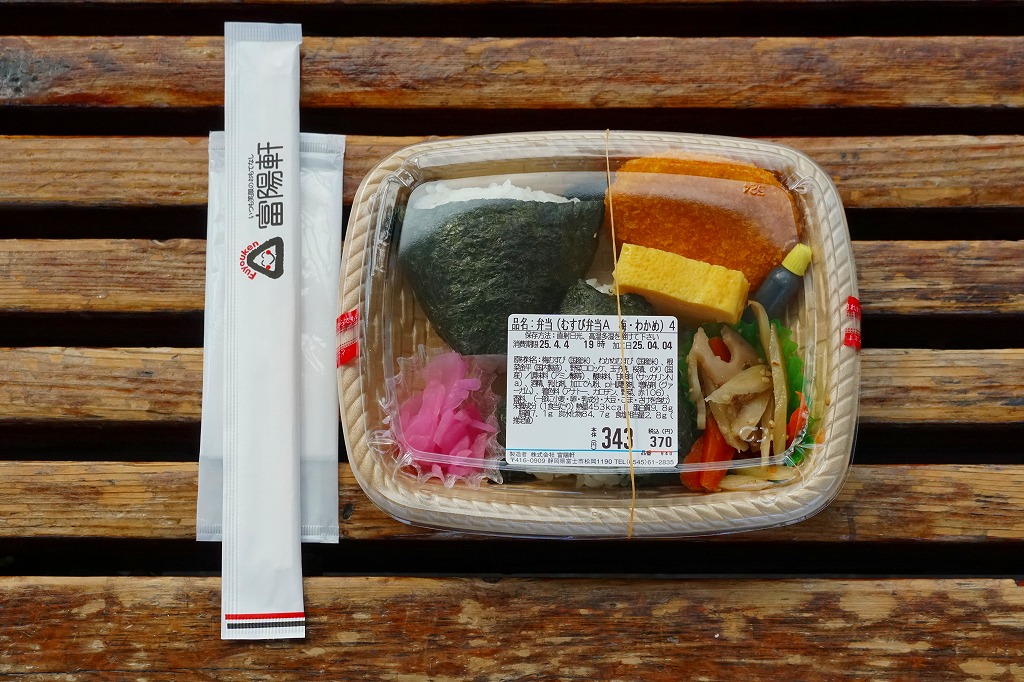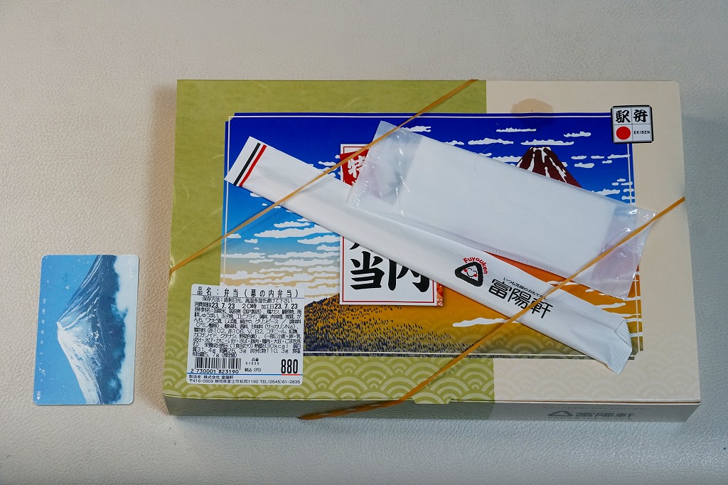 富士駅や新富士駅の、並等の幕の内駅弁。市販の仕出し弁当向けボール紙箱で、9区画のプラ製トレーに収まる中身は、日の丸御飯、サクラエビ載せ御飯、おいなりさんとかんぴょう巻、鶏カツ、サバ照焼、煮物、ポテトサラダ、しゅうまいとウインナー、オレンジと抹茶わらび餅。富士のある内容で、おつまみ向け。食事としては100円追加して幕の内弁当を買うのがよいと思った。2019年時点で現存しない模様。