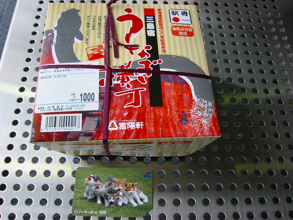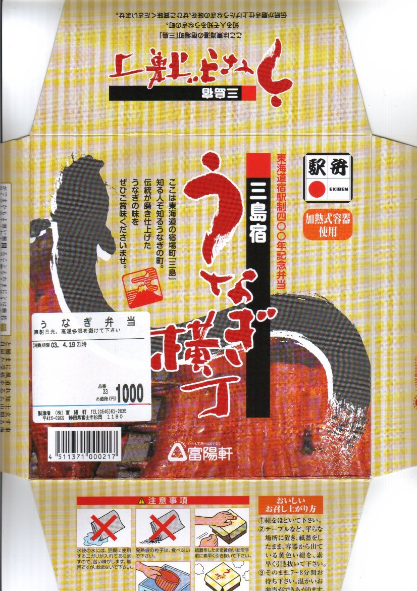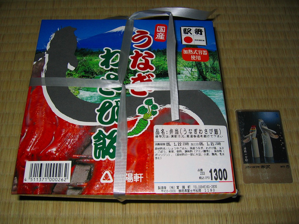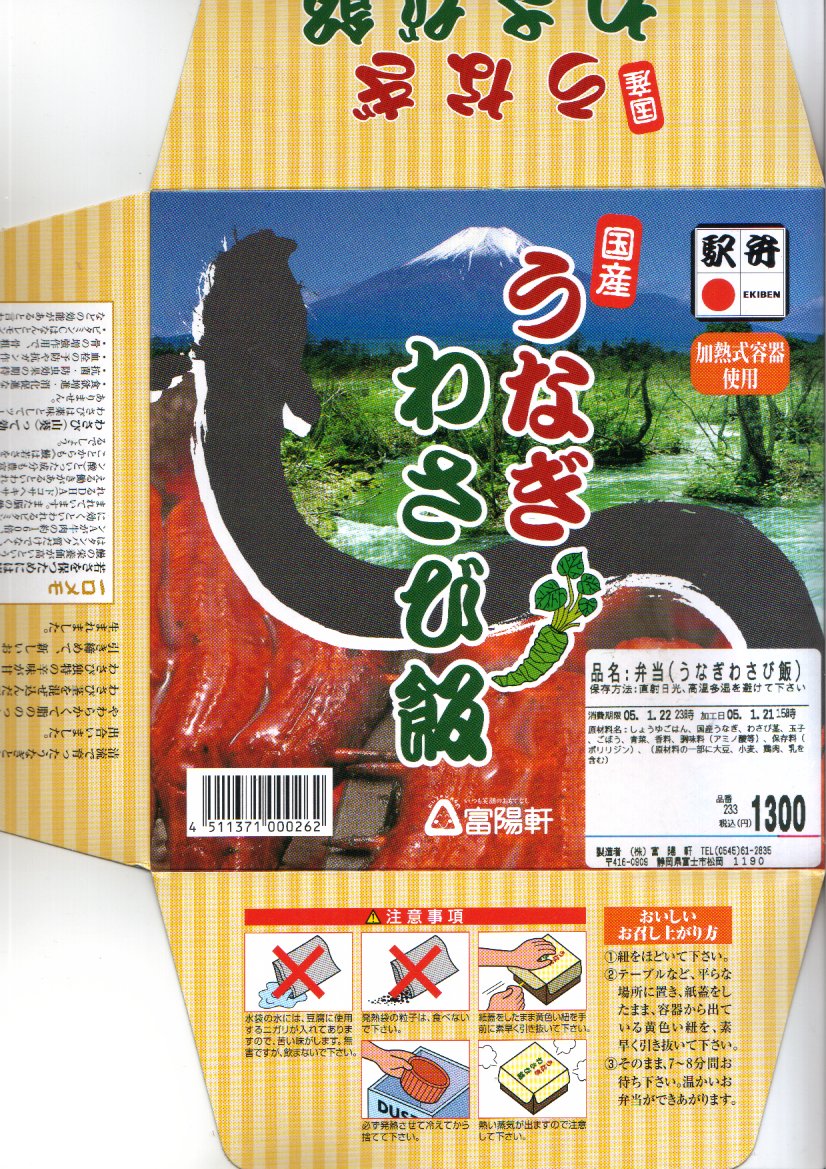 秋冬の駅弁大会シーズンに向けた、2004(平成16)年秋の新商品か。丸い加熱機能付き容器を、富士とワサビ田と鰻蒲焼の写真を載せたパッケージに入れ、ビニールひもでしばる。中身はタレ御飯の上にワサビの茎を少々散らし、錦糸卵を敷いて、鰻蒲焼とささがきごぼうと青菜を載せたもの。冷めてもおいしいのは駅弁ならでは、というのは、加熱したのだが御飯が厚かったのか、あるいは操作ミスか、鰻蒲焼まで熱が届かなかったもの。現存しない模様。