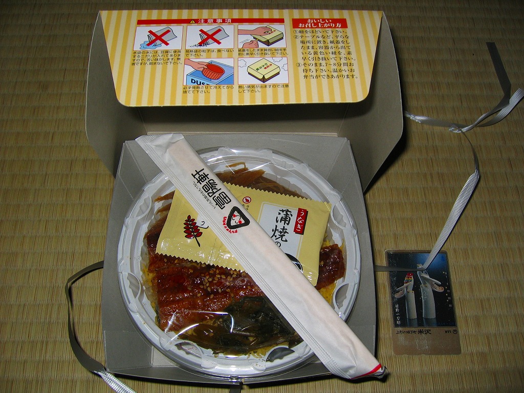 2002(平成14)年頃に発売か。丸い加熱機能付き容器を薄手のボール紙箱に入れる。中身はかなり水気の多い醤油飯の上に錦糸卵と笹掻きゴボウを敷いて鰻蒲焼を2切れ載せるもので、冷めた状態だと食べられたものではないが、暖めれば中身のすべてが柔らかく消化が良さそうな感じに変貌する。