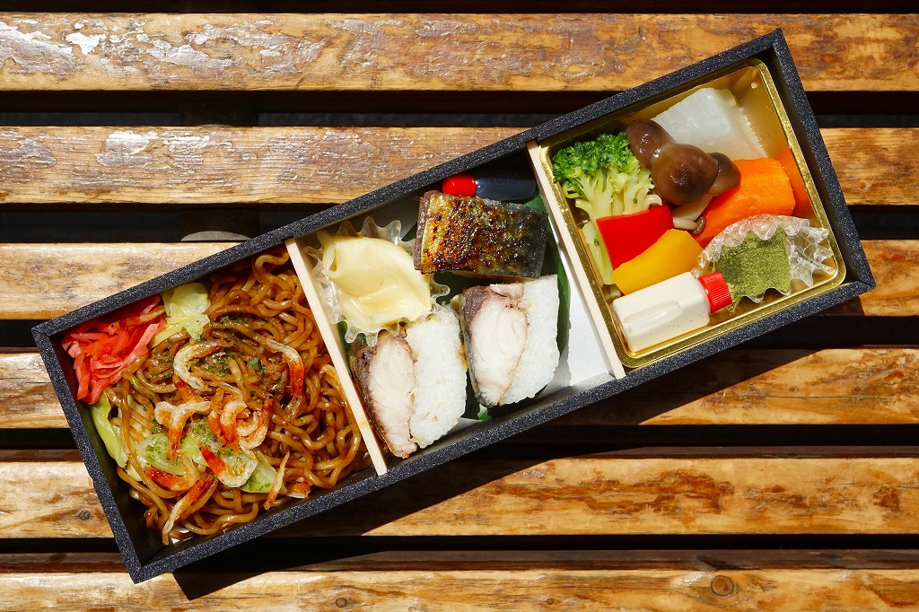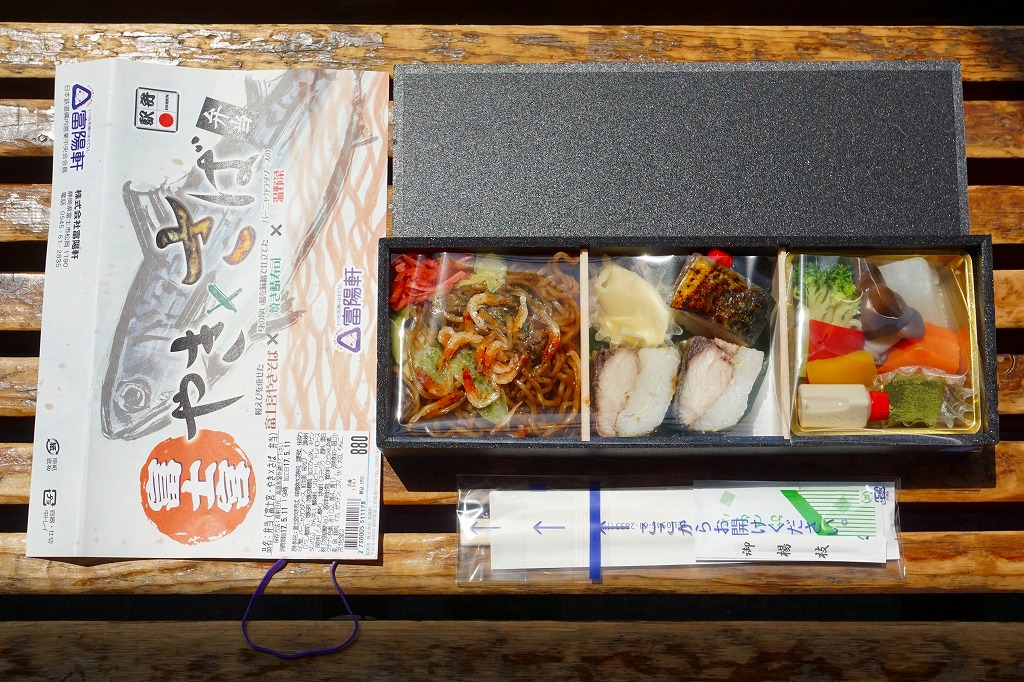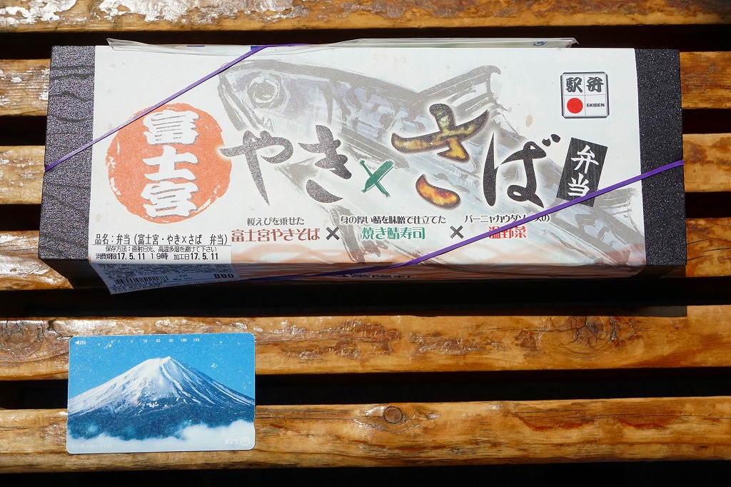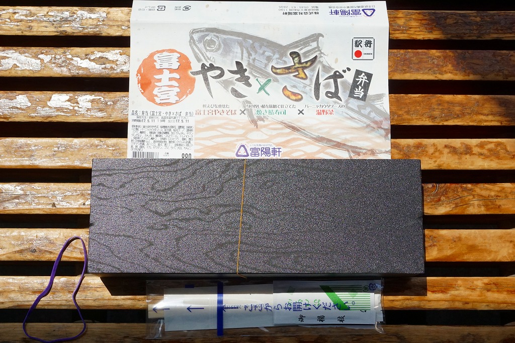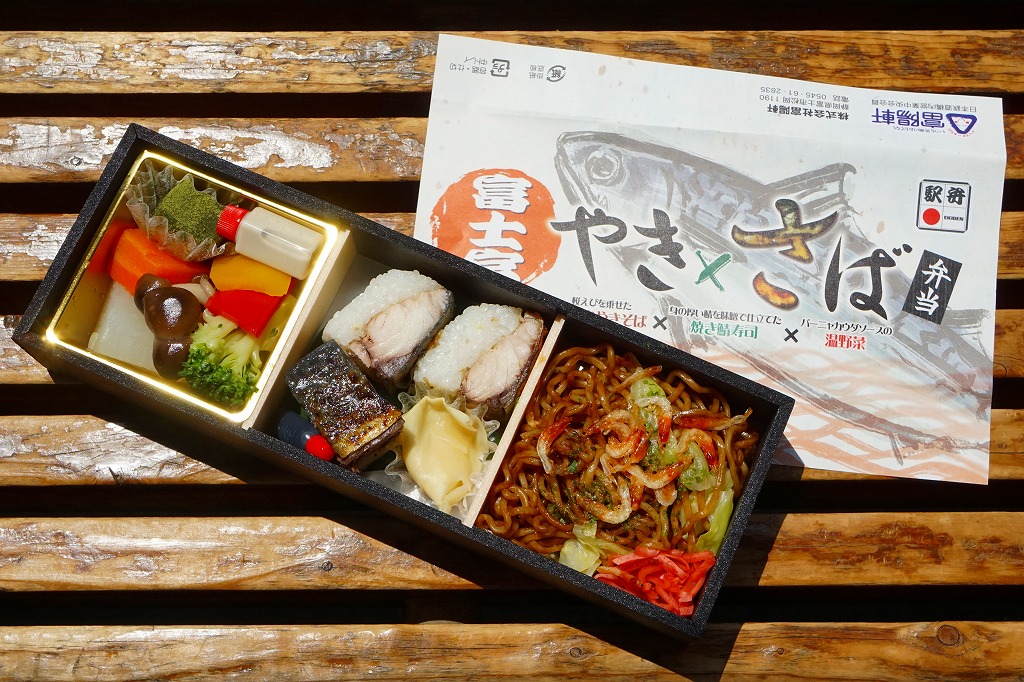 2017(平成29)年1月10日の発売。その名のとおり、そして掛紙に書かれるとおり、富士宮やきそば、焼き鯖寿司、温野菜の詰合せ。正方形3個分の横長な容器に、左から順に富士宮やきそば、味噌焼き鯖ずし、野菜の煮物とわらびもちを詰めていた。やきそばは富士宮の特徴である太さとコシとサクラエビを備え、やきさばは高級品レベルの身の太さ。野菜はおしゃれな見栄えと味。これはなかなか格好良い駅弁。しかし材料の終了を理由に、同年7月9日限りで終売。