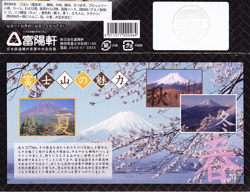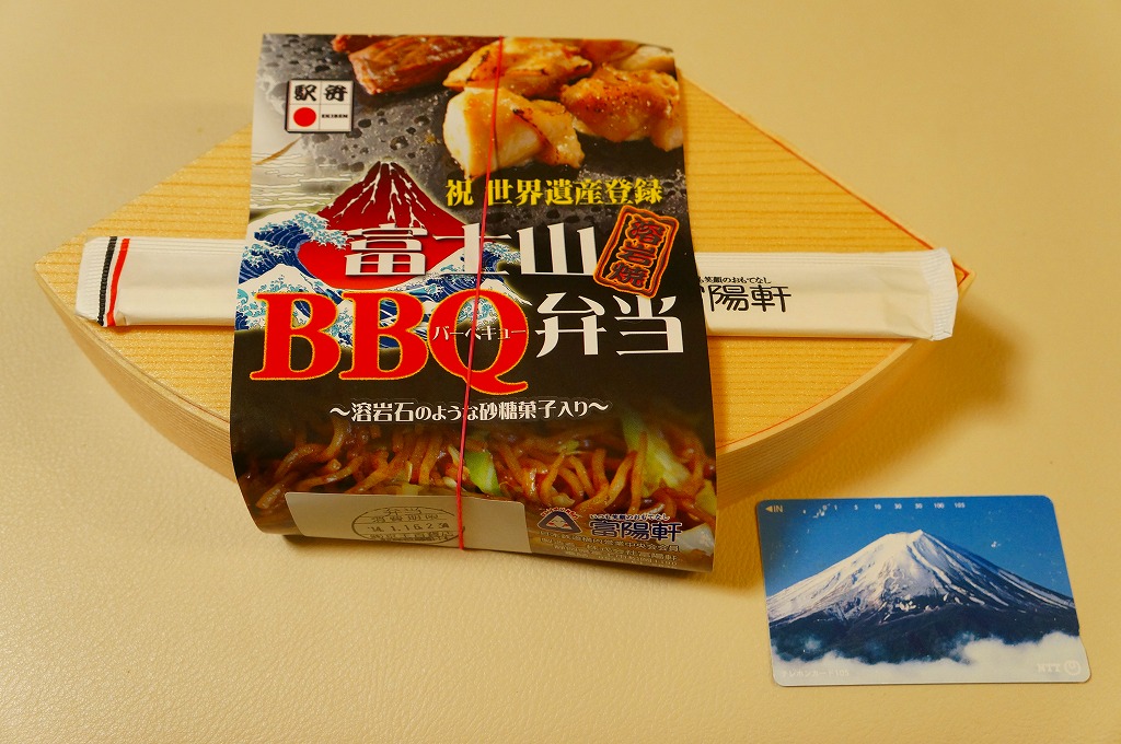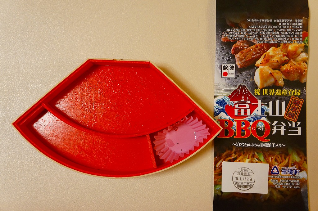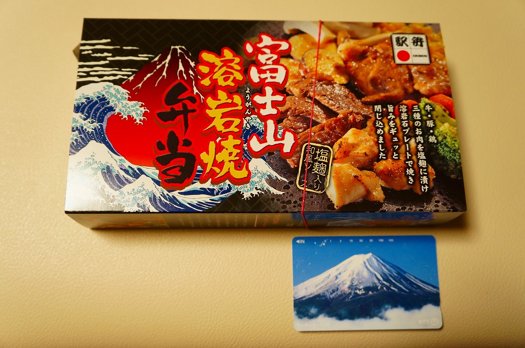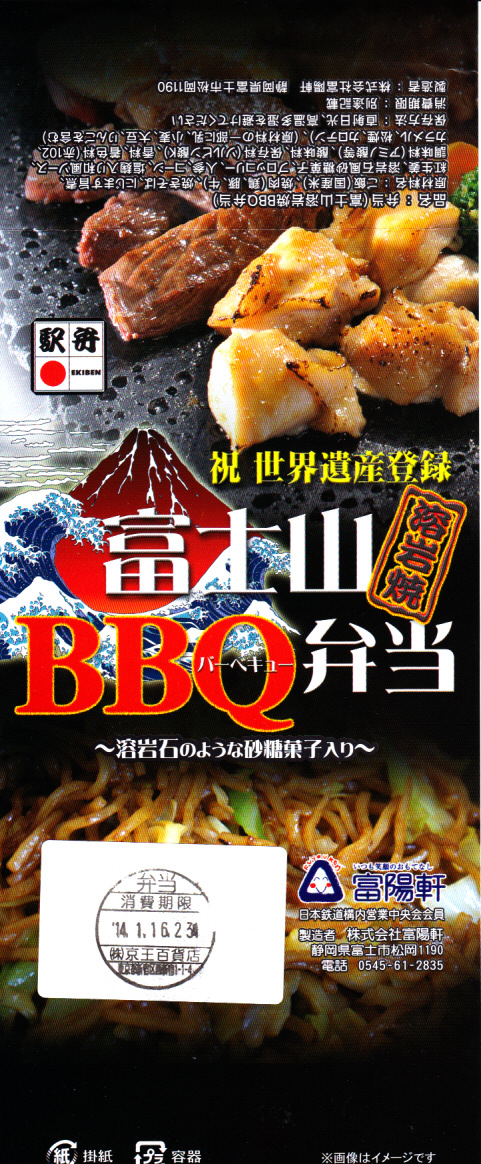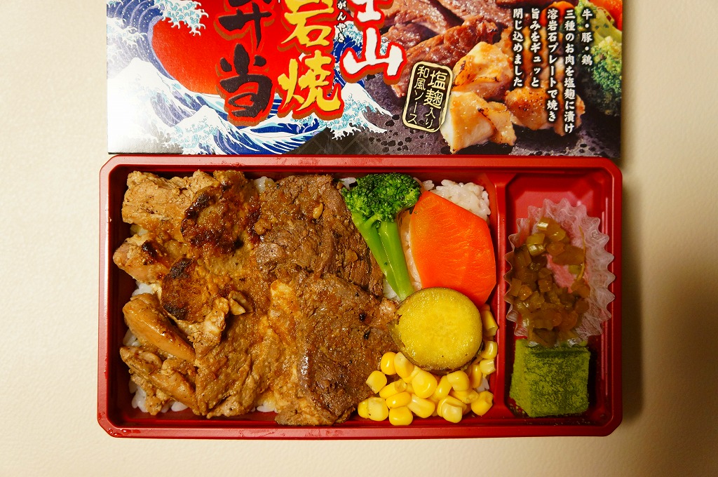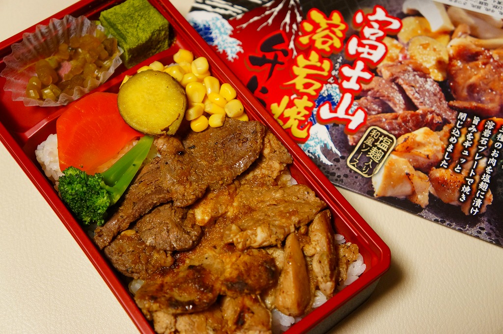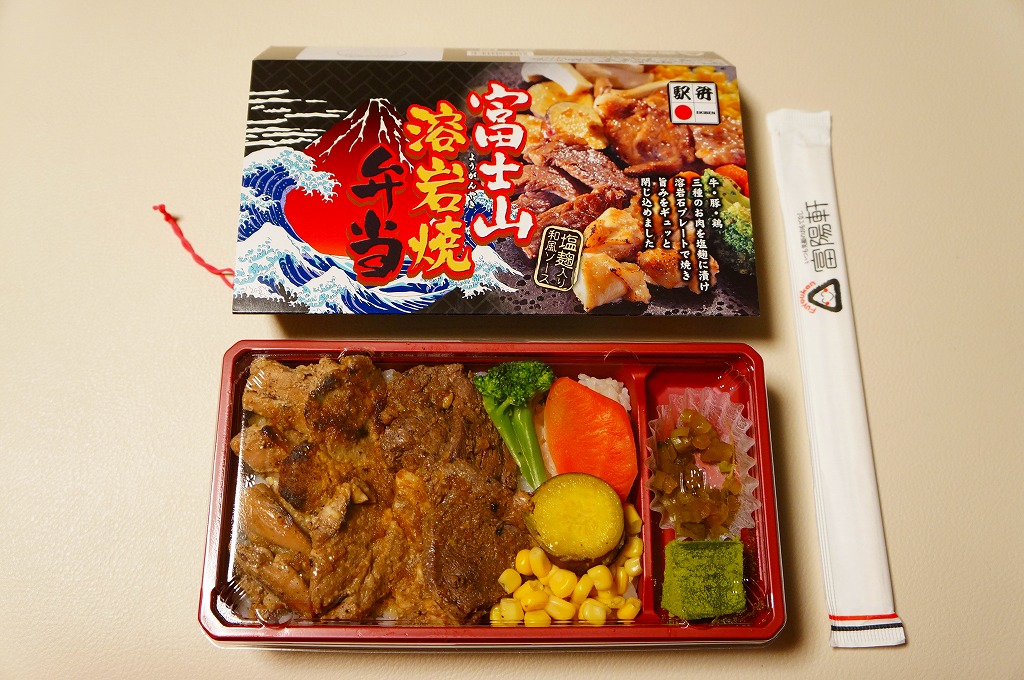2014(平成26)年1月の京王百貨店の駅弁大会で実演発売。その会期中だけ、新富士駅でも販売したらしい。富士山の形に見えてくる容器に白御飯を詰め、催事場に持ち込んだ溶岩プレートで焼いた牛と豚と鶏の焼肉を貼り、ブロッコリーとコーンとニンジンを添え、焼きそばを詰めて、ニジマス旨煮と砂糖菓子を添える。焦げた肉の香り、もちもちの焼きそば、溶岩のような菓子をガリガリかじりながら、イベント向けの商品としてはワイルドで面白くて良いなと感じた。