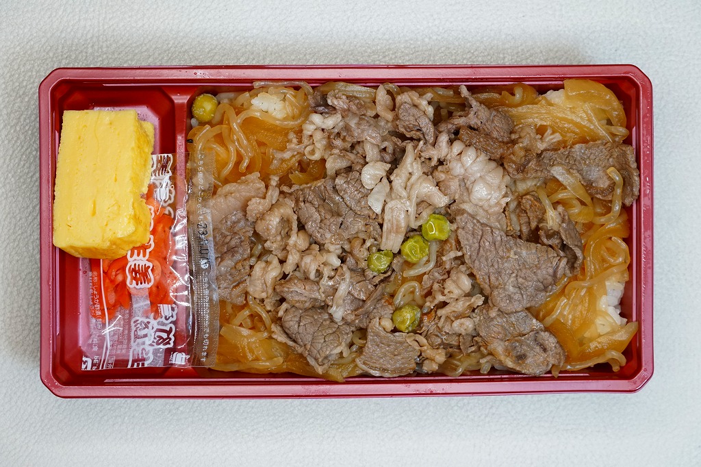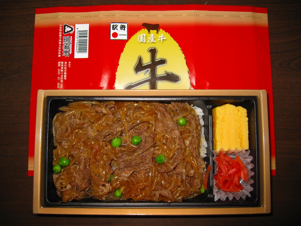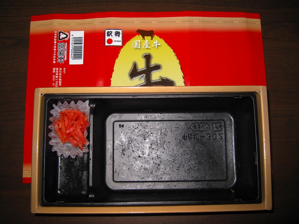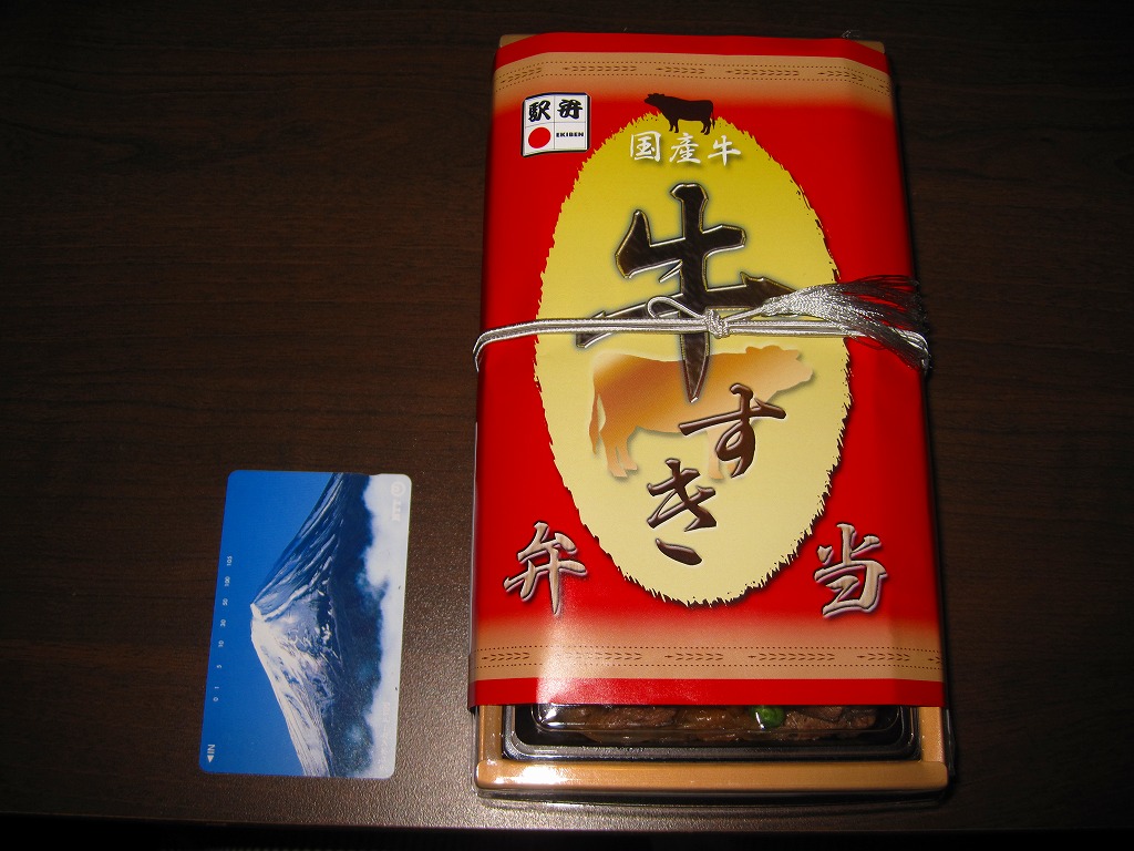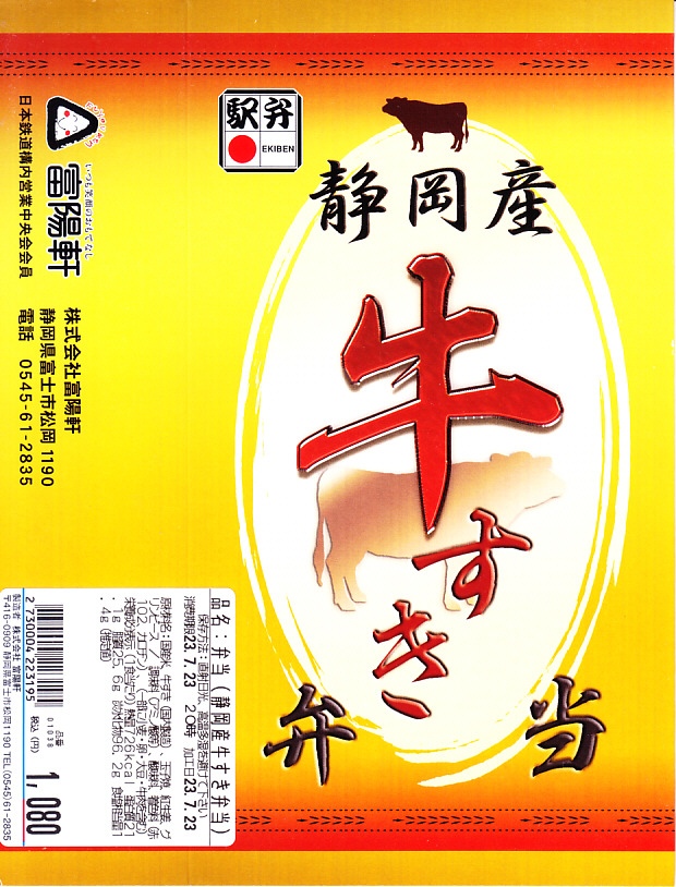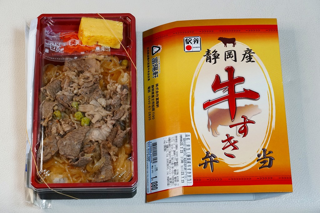 2009(平成21)年に発売か。新富士駅でのみ販売される駅弁だそうな。ボール紙を組み立てた長方形の容器に透明なふたをして、商品名を書いた赤い掛紙で巻く。黒いプラ製トレーに収まる中身は、白御飯の上を牛肉、タマネギ、糸こんにゃくとグリーンピースで覆い、玉子焼と紅生姜を添える牛丼。国産牛と書かれるメインの牛肉が、駅弁としても惣菜としてもずいぶん固めな感じ。しかし飯も肉もたっぷり入っている。価格は2010年の購入時で840円、2014年時点で900円。2019年5月に上記の「静岡産牛すき弁当」へリニューアル。
