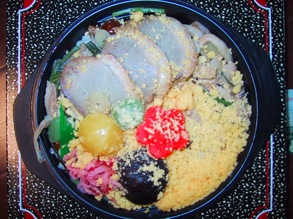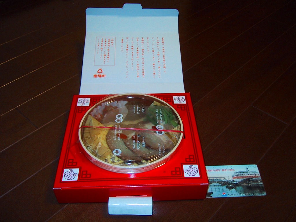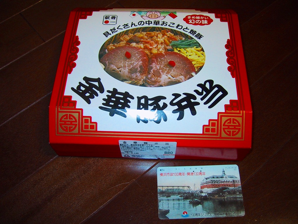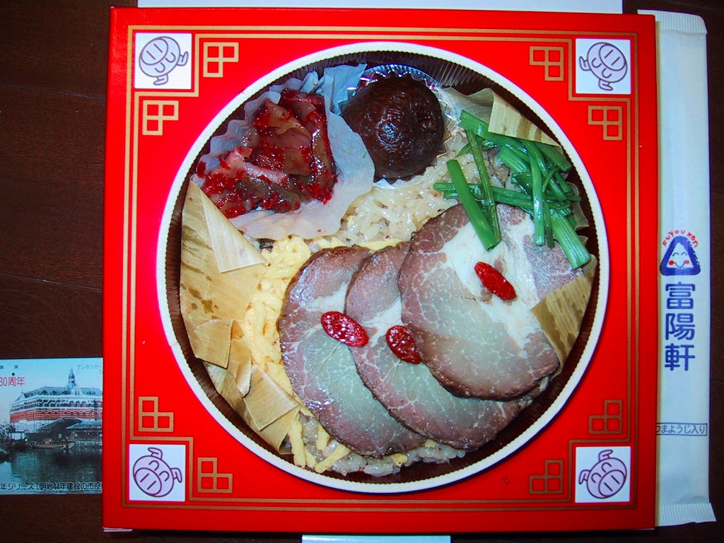 2000(平成12)年に発売。立体的なふたがユニークな正方形の大きなボール紙製組立パッケージの中に、円形の容器をはめ込む。中身は中華おこわの上に金華豚の焼豚を三切れ載せ、ザーサイや錦糸卵を添えた、中華風弁当。デザートにはライチが入っていた。焼豚はジューシーというかクリーミーというか、臭みがまったくない上にサクッとした歯ごたえと溶けるような食感が両立した、豚肉のイメージを覆すグルメなもので、この内容で880円はお買い得と感じる。現在は販売されていない模様。