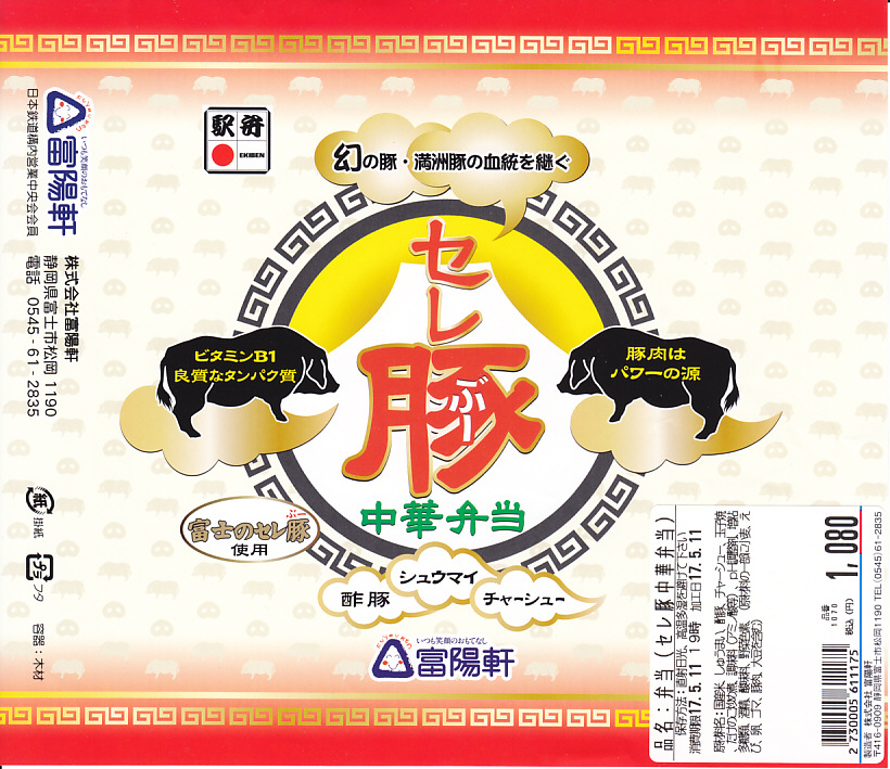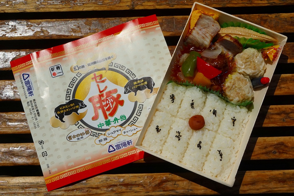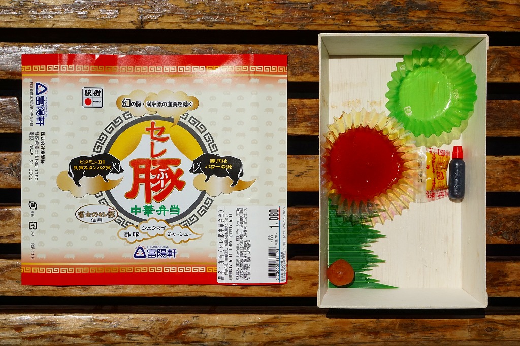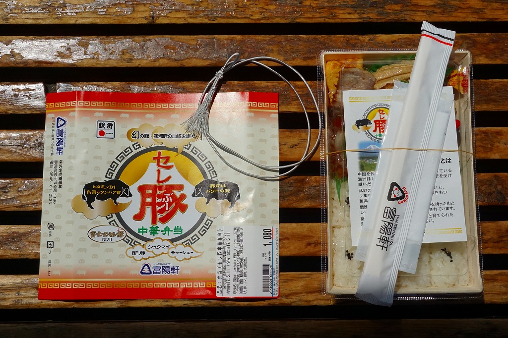 2017(平成29)年5月1日の発売。日の丸俵飯に、「富士のセレ豚(ぶー)」の豚肉を使うという焼売2個、酢豚、チャーシュー2枚、そして玉子焼とタケノコを添える。見た目は古風な幕の内駅弁で、中身は豚肉弁当で、雰囲気は中華風幕の内弁当。偶然か必然か、そんなカテゴリの大先輩格である横浜駅のシウマイ弁当に似ているような、そうでもないような。富士のセレ豚とは、静岡県富士宮市の畜産業者の商品で、中国大陸在来の満州豚を基礎に育成・開発されたそうな。2019年4月限りで終売。