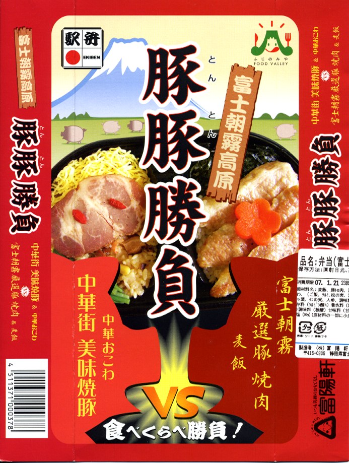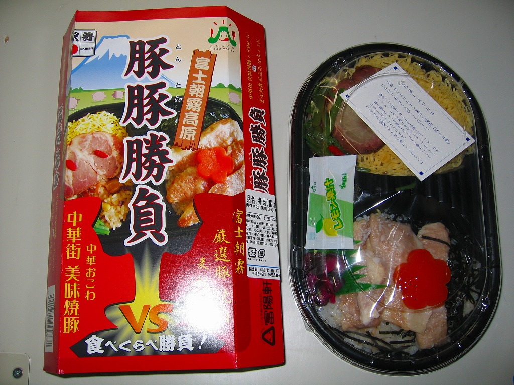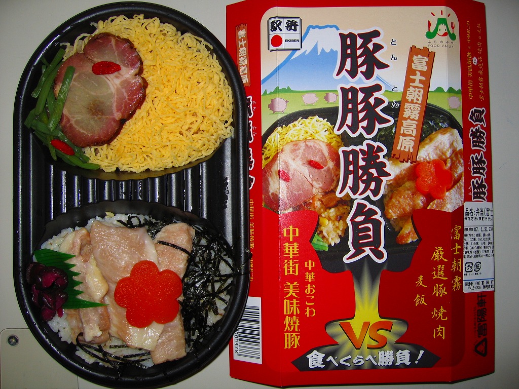 秋冬の駅弁大会シーズンに向けた、2006(平成18)年秋の新商品か。競技場状の黒いプラ容器に透明なふたをかけて、商品名を賑やかに描いた紙枠にはめる。中身は麦飯に富士朝霧厳選豚焼肉を載せた豚丼と、中華おこわにたっぷりの錦糸卵と一切れの中華街美味焼豚を載せた豚丼が、半分ずつ。