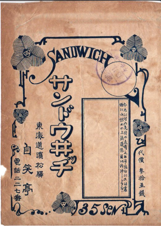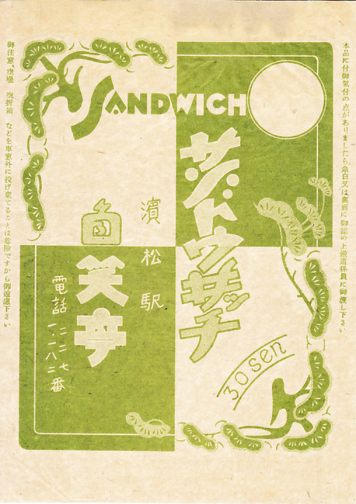 第二次大戦前のものと思われる、昔の浜松駅弁の掛紙。時期を推定できる情報に乏しいが、紙質が良くないと思うので戦中の、1940(昭和15)年前後のものか。サンドイッチの駅弁は東海道本線の各駅で売られただろうが、浜松駅のそれについて見聞きした記憶がない。
