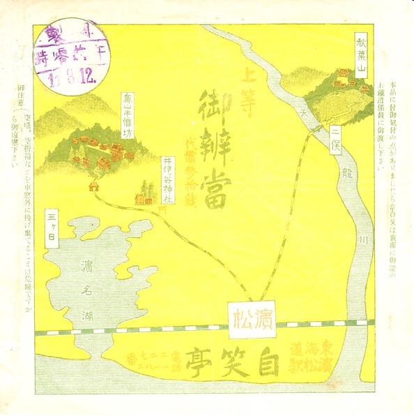 1936(昭和11)年3月12日の調製と思われる、昔の浜松駅弁の掛紙。鉄道の路線図に、二俣と秋葉山、井伊ノ谷神社(井伊谷宮)と奥山半僧坊(方広寺)、三ヶ日と浜名湖を描く。この路線図は東海道本線を除くと、現在の遠州鉄道のもの。右側にある現在の新浜松駅から西鹿島駅までの鉄道線に加え、当時の板屋町駅から分岐し奥山駅までの奥山線があった。1964年までに廃止。