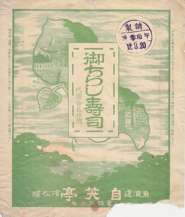 1937(昭和12)年3月20日12時の調製と思われる、昔の浜松駅弁の掛紙。ちらしずしに「御」を付けるのは変な感じで、当時としても浜松駅弁に独特の表記だったらしい。浜名湖の風景を背景に五社神社と八幡宮を載せた絵柄は、当時の駅弁掛紙として標準的な姿。