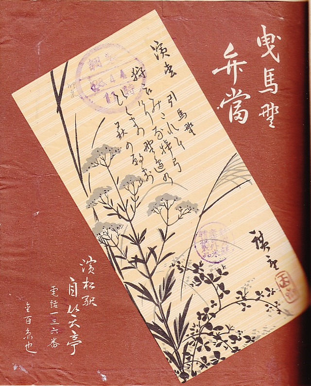 1953(昭和28)年4月4日11時の調製と思われる、昔の浜松駅弁の掛紙。崩し字がきつく、とても読みにくい。曳馬や引馬あるいは引間ないし疋馬(ひくま)は、万葉集の時代からの現在の浜松か豊橋のあたりの地名で、五畿七道の律令時代に東海道の宿駅があったという。浜松は平安時代末期の荘園の名前で、江戸時代にはこの名が地名で定着した。曳馬は浜松市内に現存する地名であるほか、浜松城の前身が曳馬城であった。