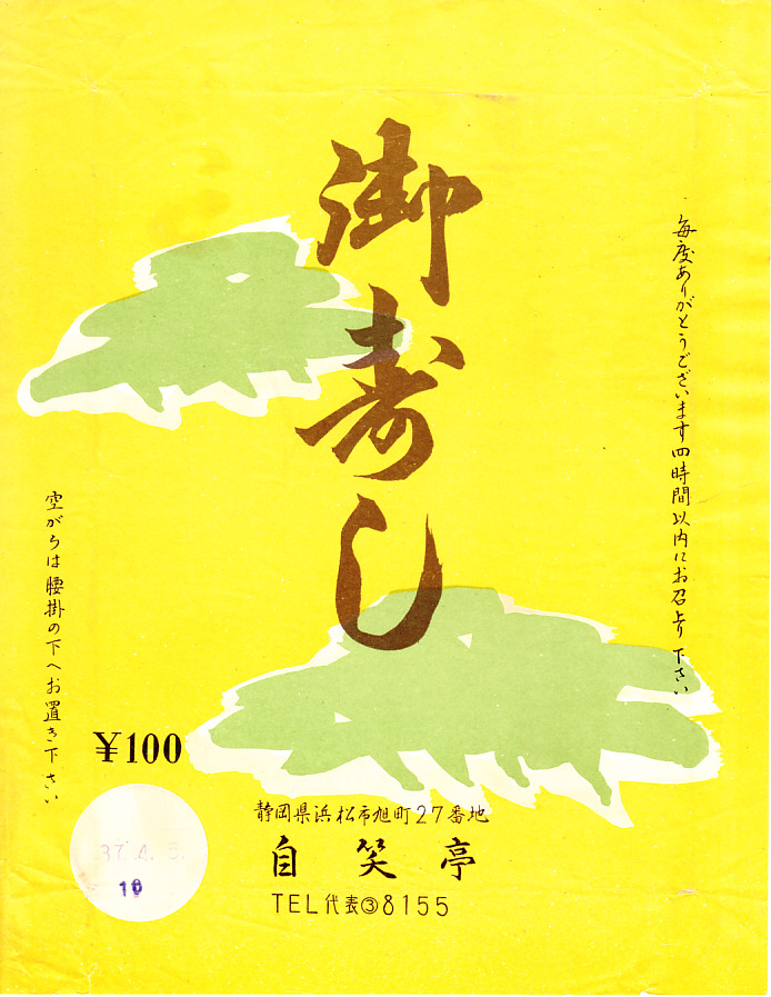 1962(昭和37)年4月5日16時の調製と思われる、昔の浜松駅弁の掛紙。下記の1959年5月のものと変わらない、シンプルこのうえない絵柄は、浜と松に文字で寿しと解釈か。
