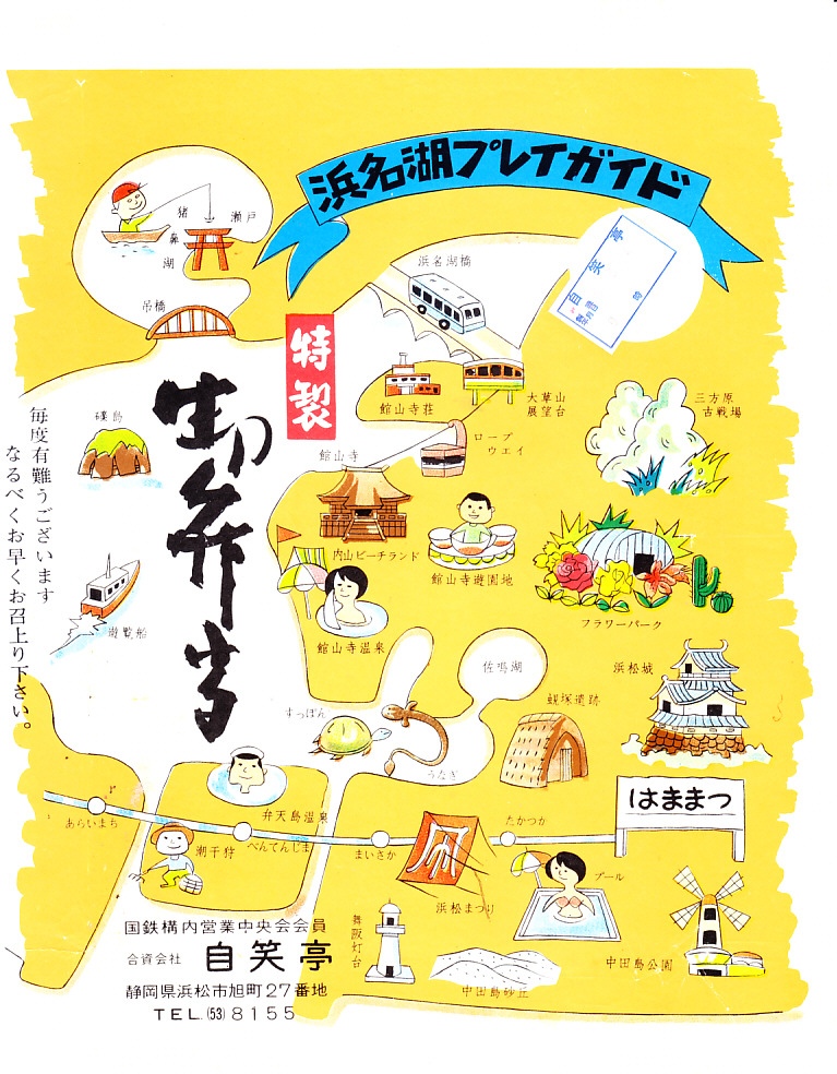 1963(昭和38)年3月4日の調製と思われる、昔の浜松駅弁の掛紙。「浜名湖プレイガイド」として、近隣の名所の数々を賑やかなイラストで描いた。