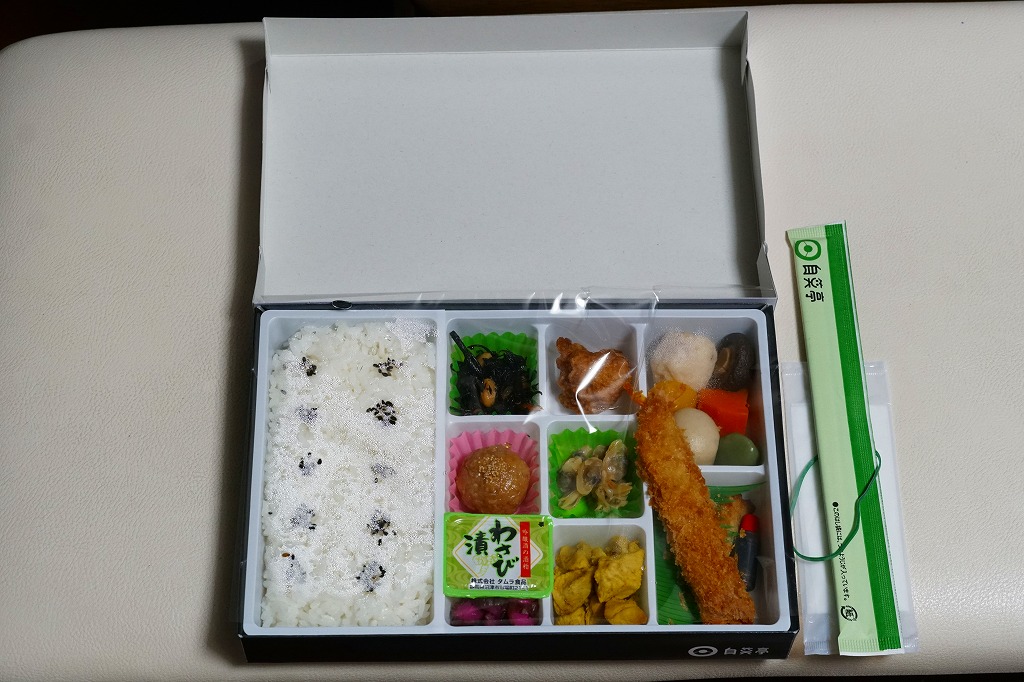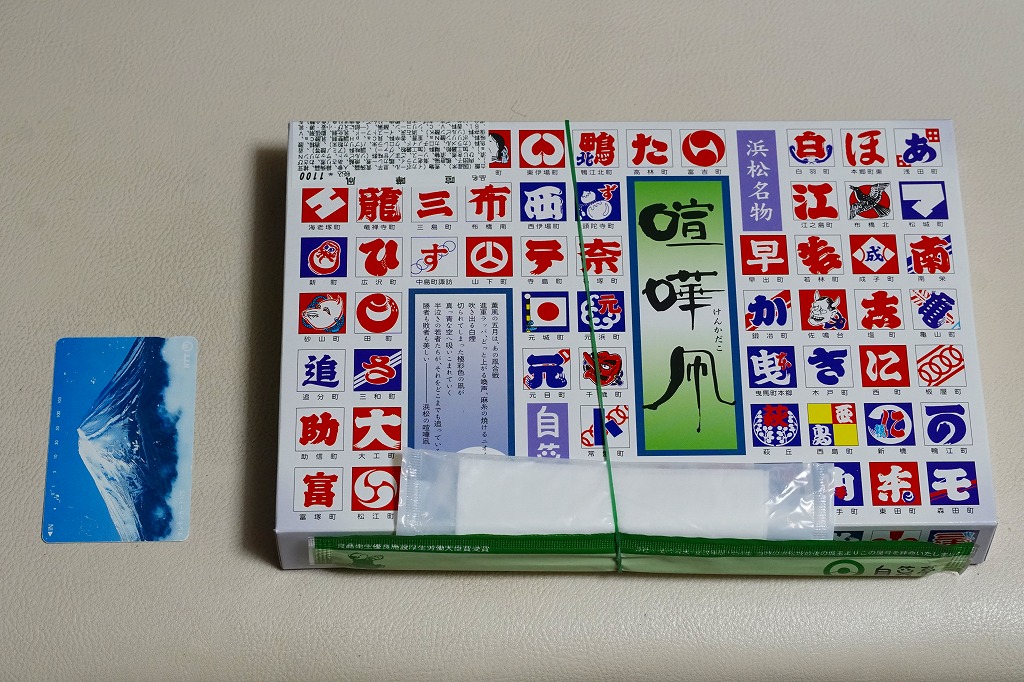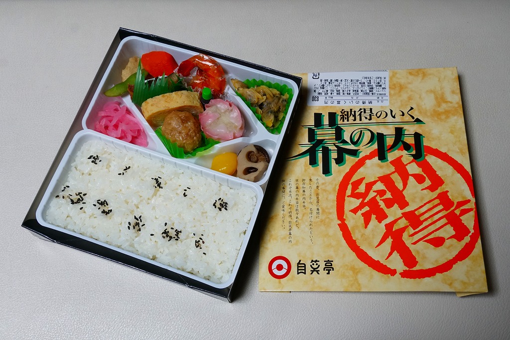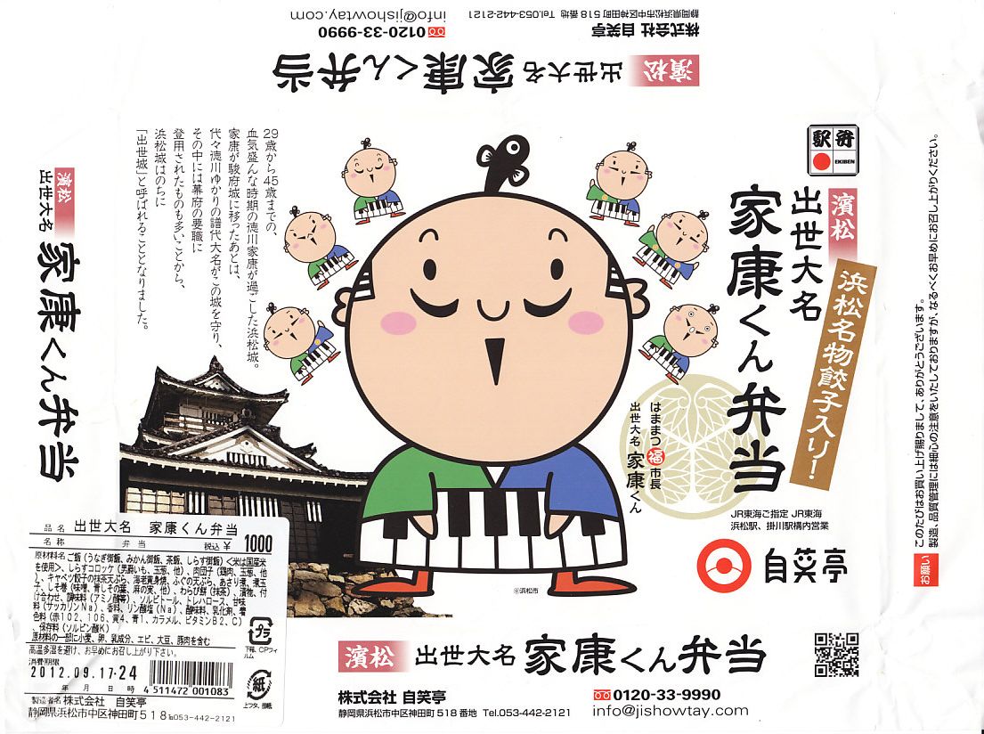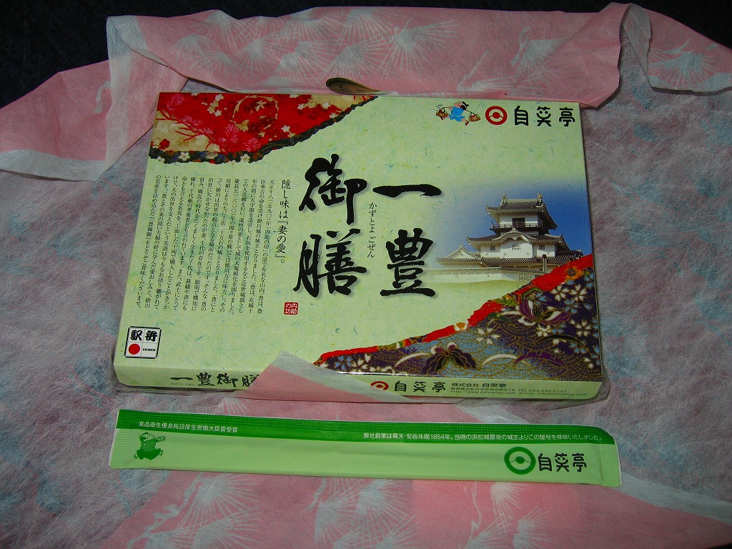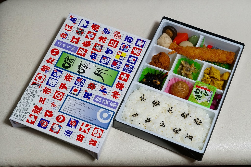 変わった名前をした、浜松駅の並等幕の内駅弁。白御飯のトレーと、焼サバ、エビ煮、玉子焼、焼売、肉団子、アサリ、枝豆、煮物などのおかずを詰めたトレーを、専用の紙箱に収める。プラ製トレーに散らしながら粒を揃えて整然とさせる見た目はきれい。しかしそんな容器のせいか、気分的なものか、味は近隣の駅弁屋よりは今一歩だったような。価格は2010年時点で800円、2014年4月の消費税率改定で830円、2020年時点で850円、2023年時点で900円。