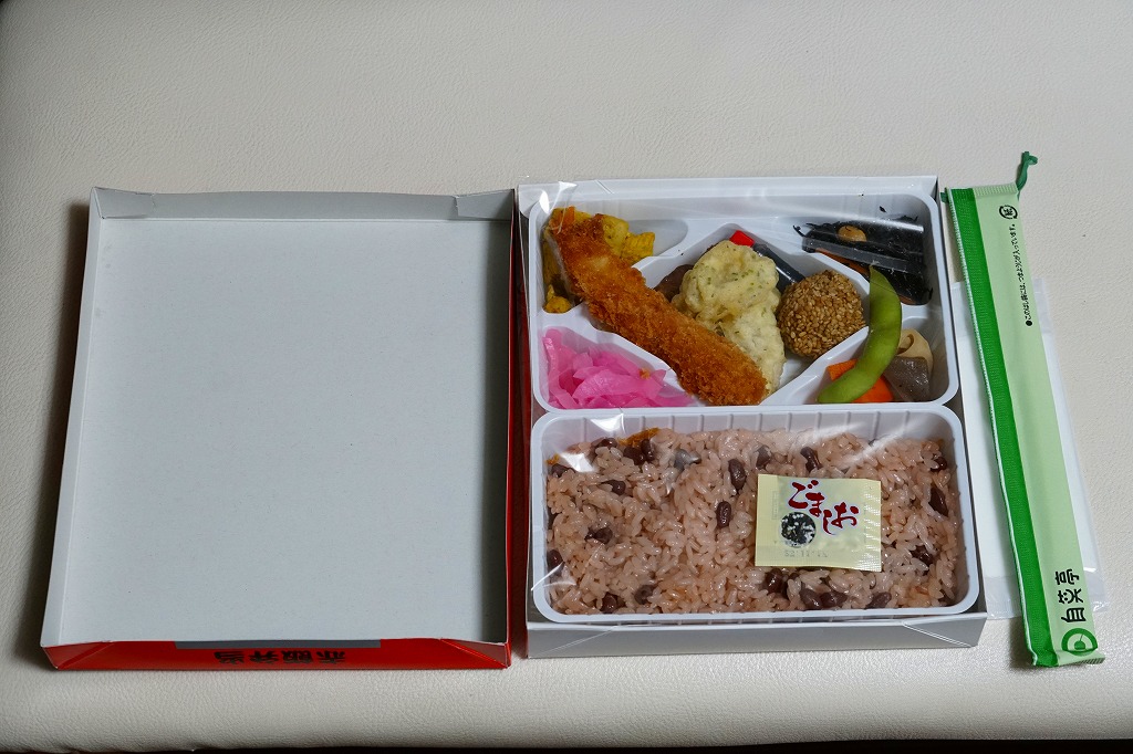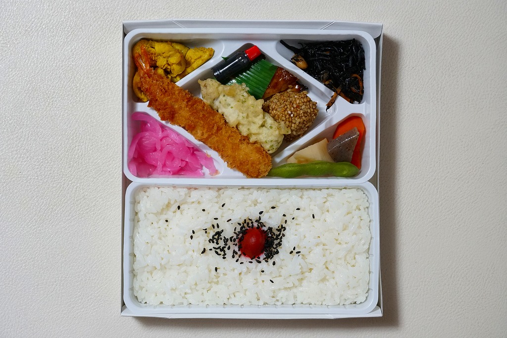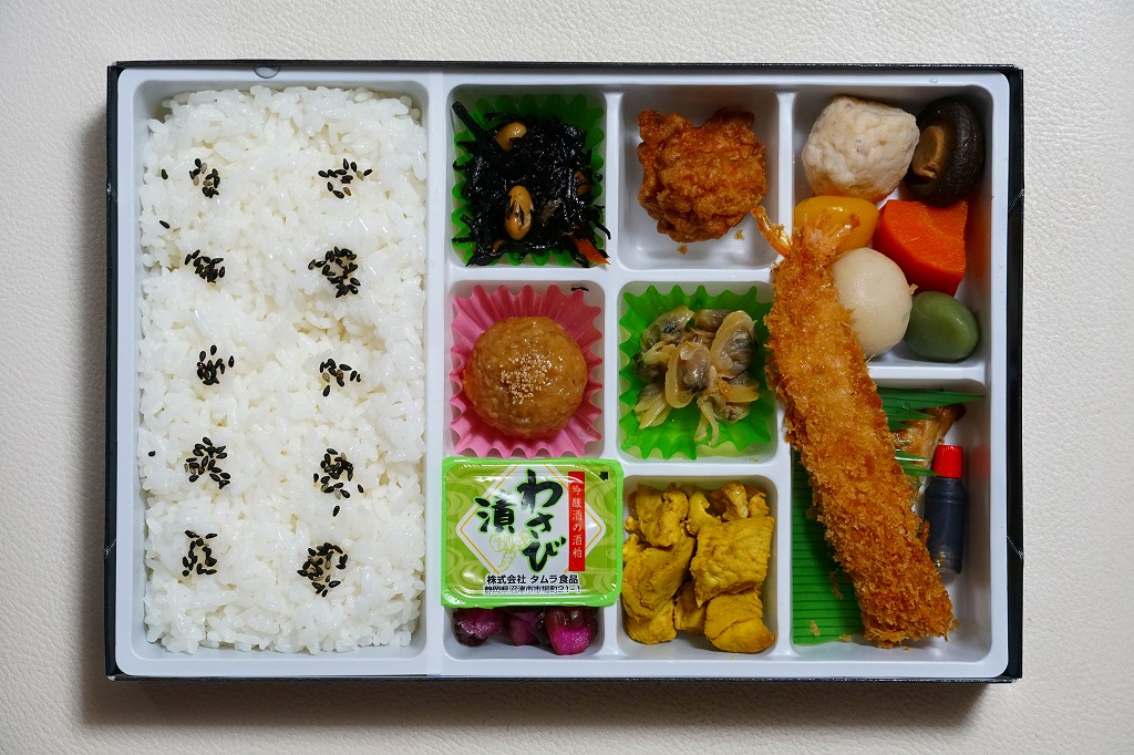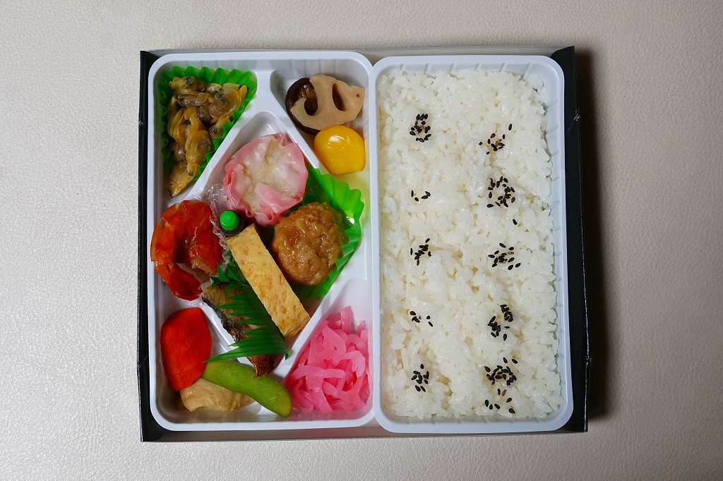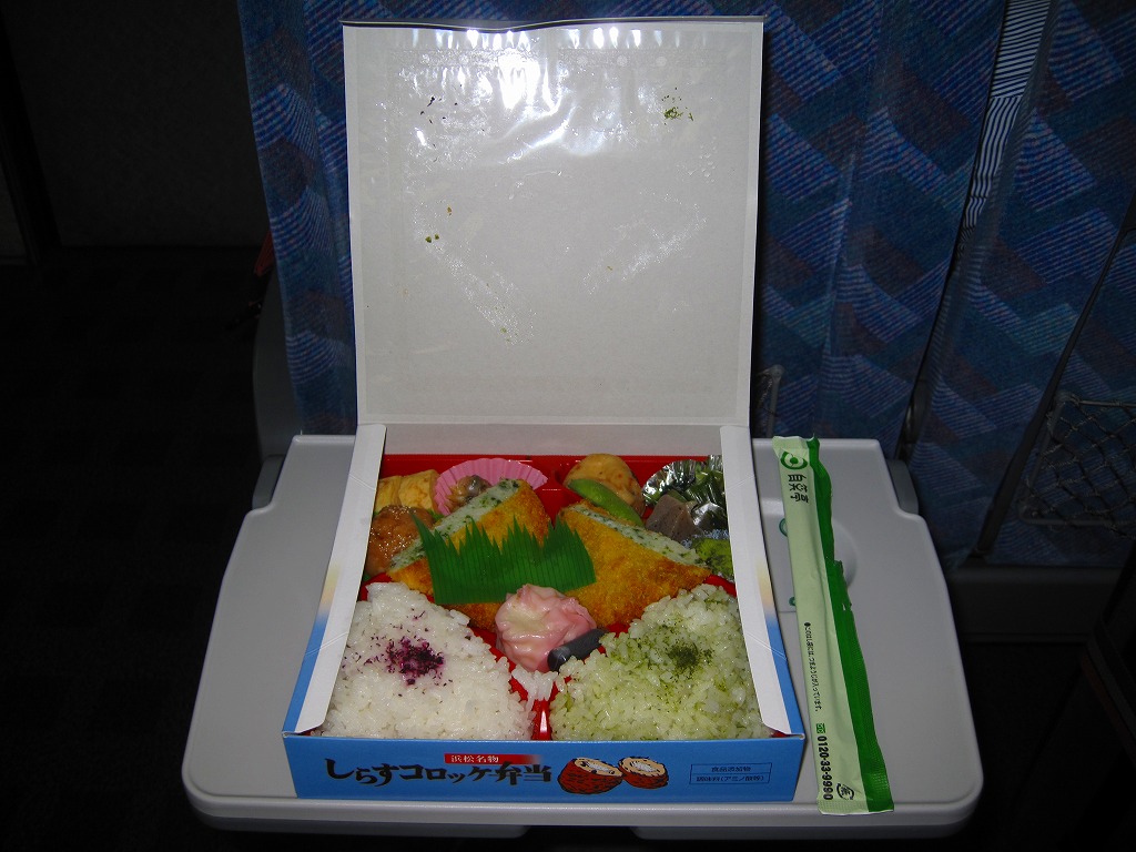 2010(平成22)年の夏までに発売か。正方形のボール紙の容器には、シラス入りコロッケと遠州灘の簡単なイラストと宣伝文が描かれる。赤いプラ製トレーに収まる中身は、白御飯と緑茶飯、しらすコロッケ、肉団子、アサリ煮、玉子焼、こんにゃくやがんもどきなどの煮物、しゅうまい、わらびもち。この価格ではなかなかの分量で、風味はとても柔らか。価格は2011年の購入時で800円、2014年時点で830円。2014年頃までの販売か。