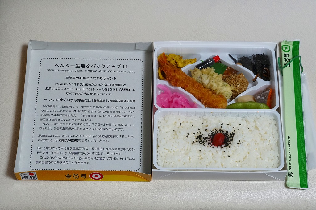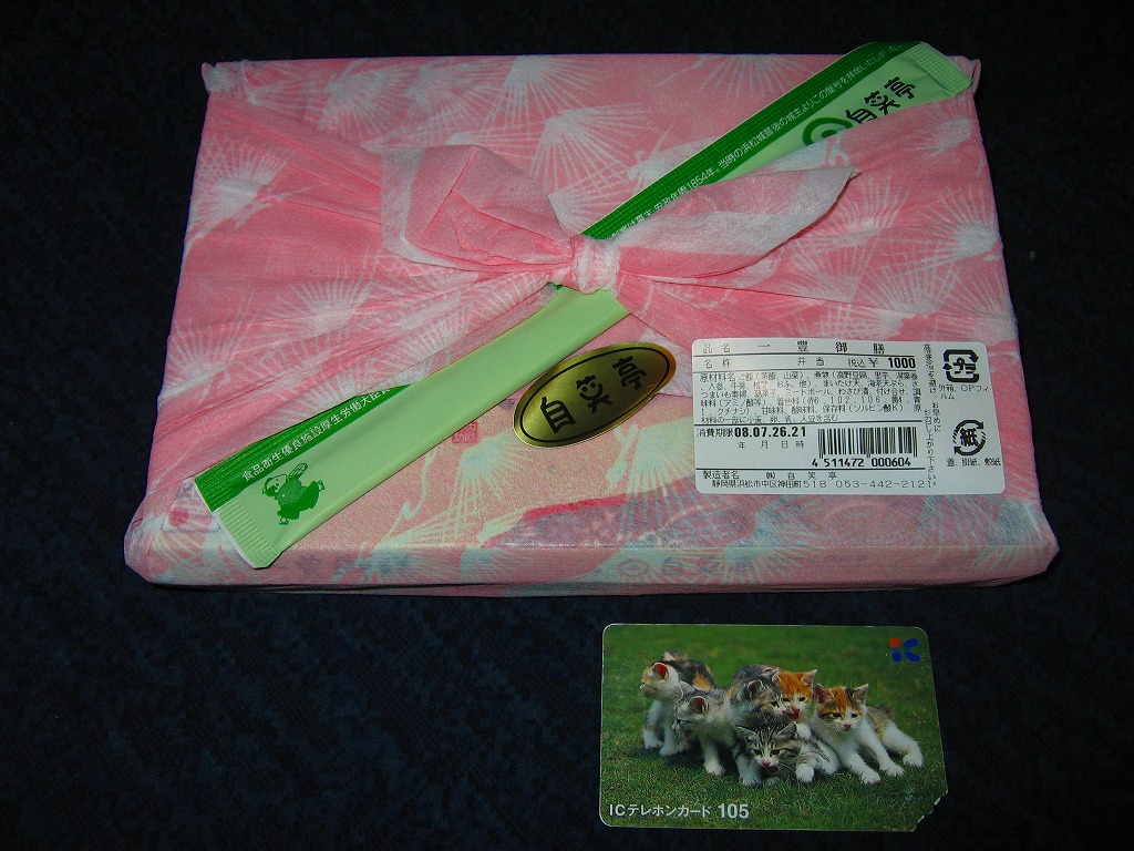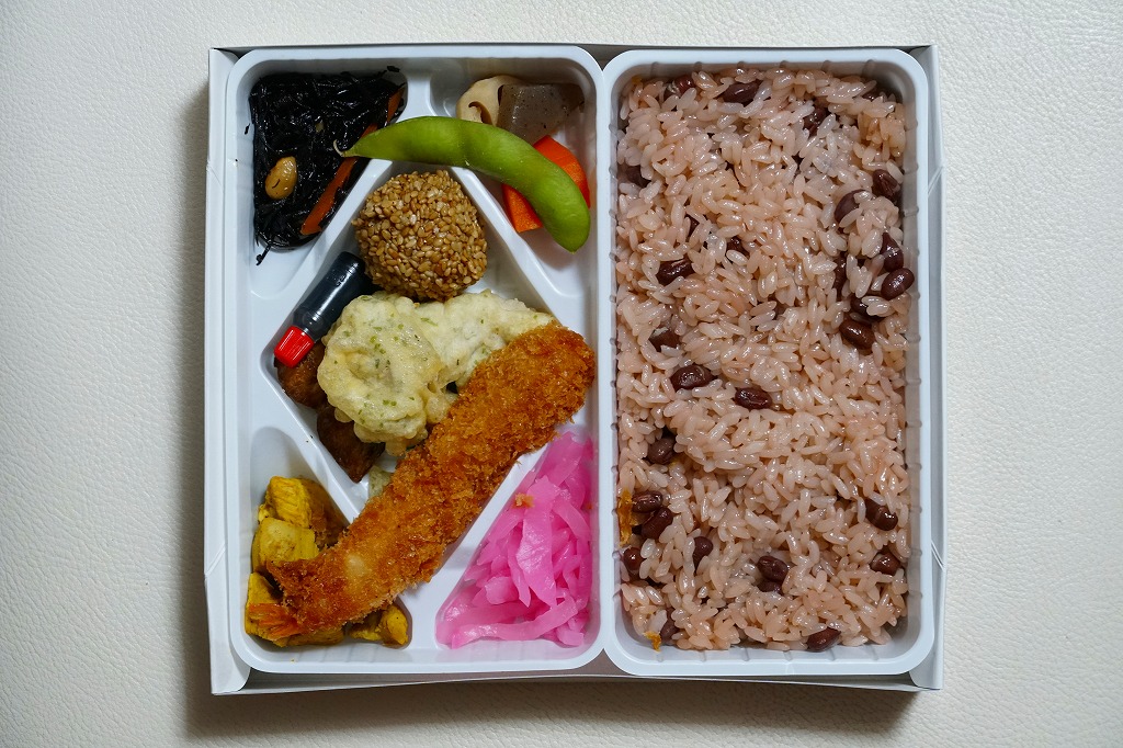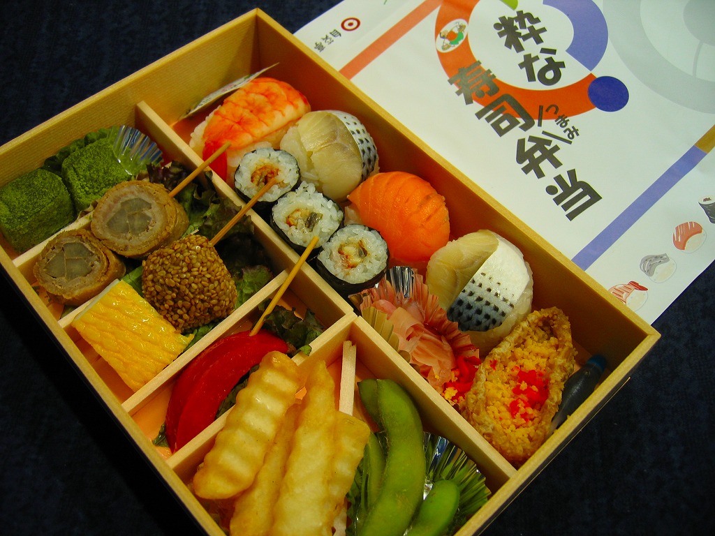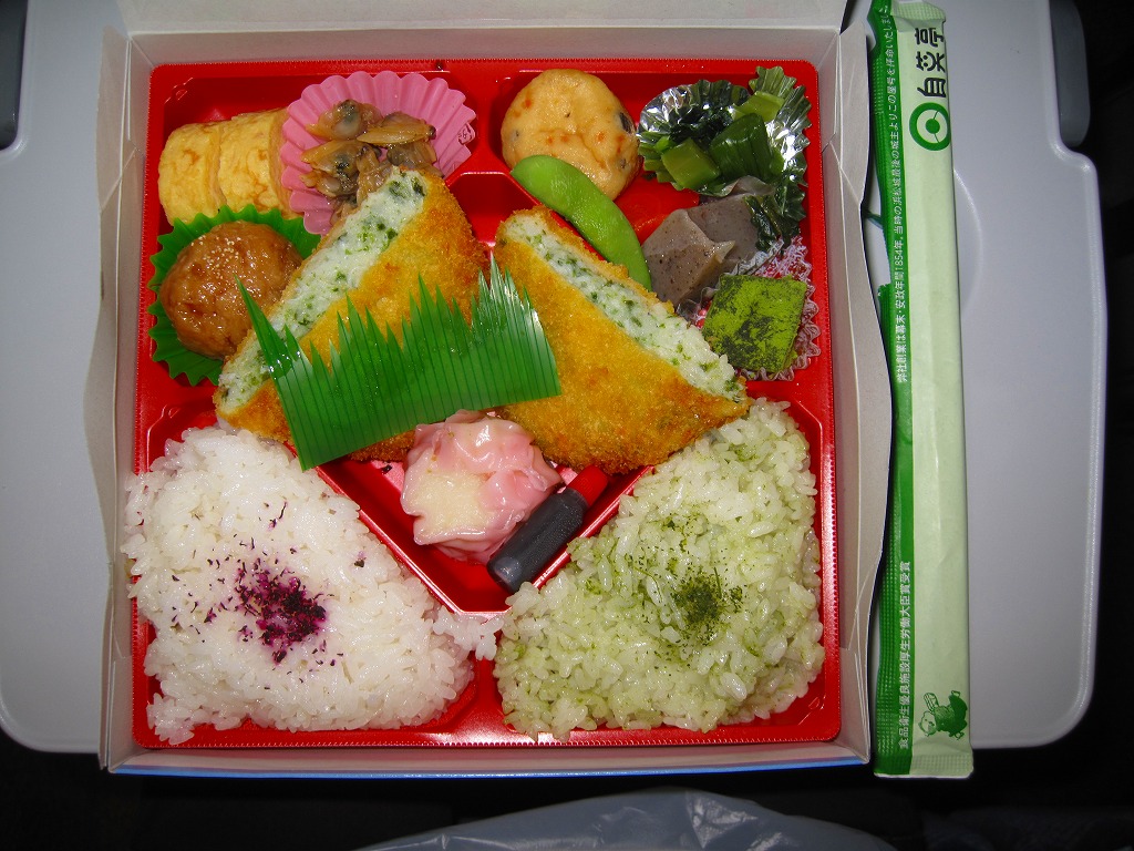 2010(平成22)年の夏までに発売か。正方形のボール紙の容器には、シラス入りコロッケと遠州灘の簡単なイラストと宣伝文が描かれる。赤いプラ製トレーに収まる中身は、白御飯と緑茶飯、しらすコロッケ、肉団子、アサリ煮、玉子焼、こんにゃくやがんもどきなどの煮物、しゅうまい、わらびもち。この価格ではなかなかの分量で、風味はとても柔らか。価格は2011年の購入時で800円、2014年時点で830円。2014年頃までの販売か。