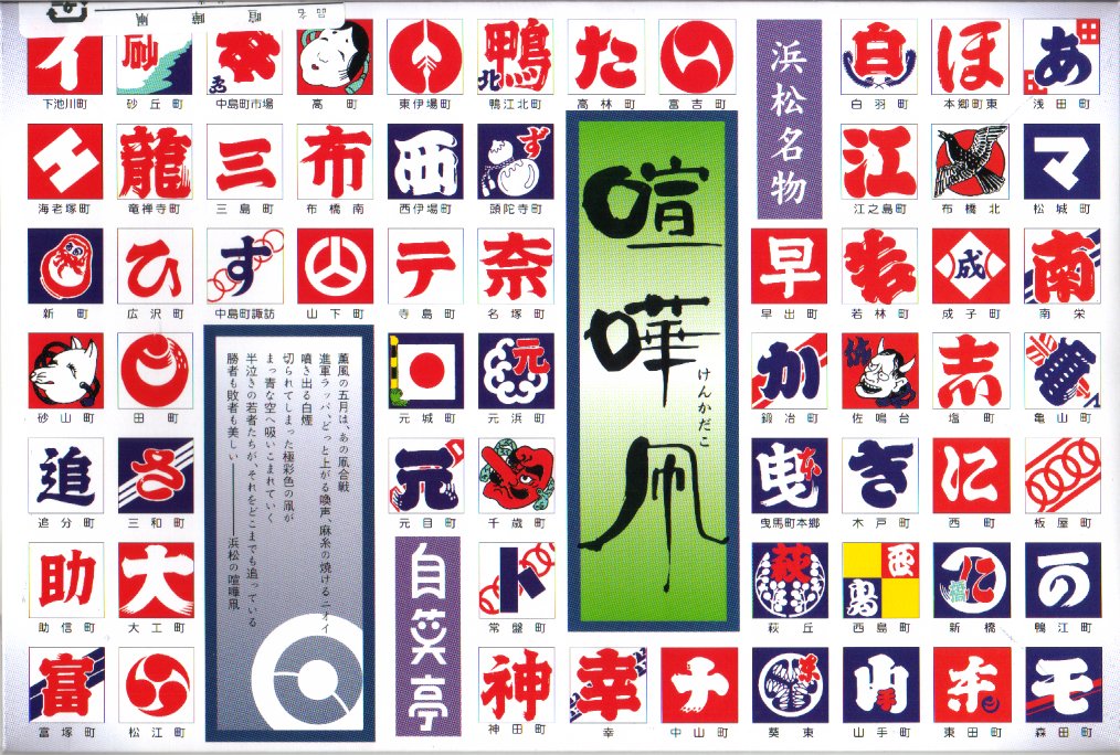 喧嘩凧(けんかだこ)は、浜松では1950(昭和25)年から「浜松まつり」の一環で行う、5月3〜5日の凧揚げ合戦。遠州灘や天竜川に近い公園で、100以上の町内会がたたみ2畳分くらいある大凧を揚げ、相手にぶつけて凧ひもを切れば勝ち。実際の喧嘩が絶えず事件にも発展する、相当に荒くれたイベントのため、実行委員会は暴力の排除に苦心し続ける。